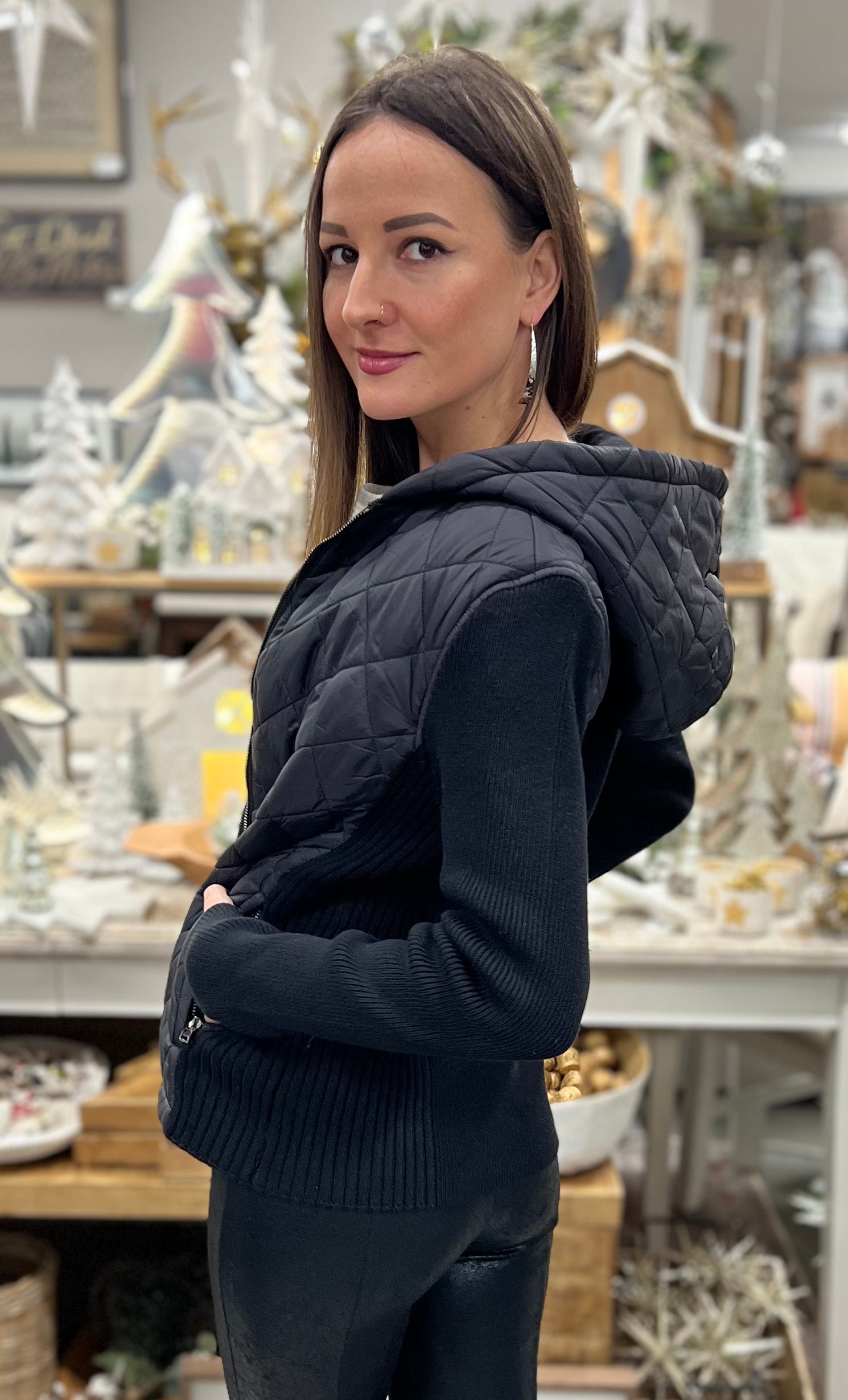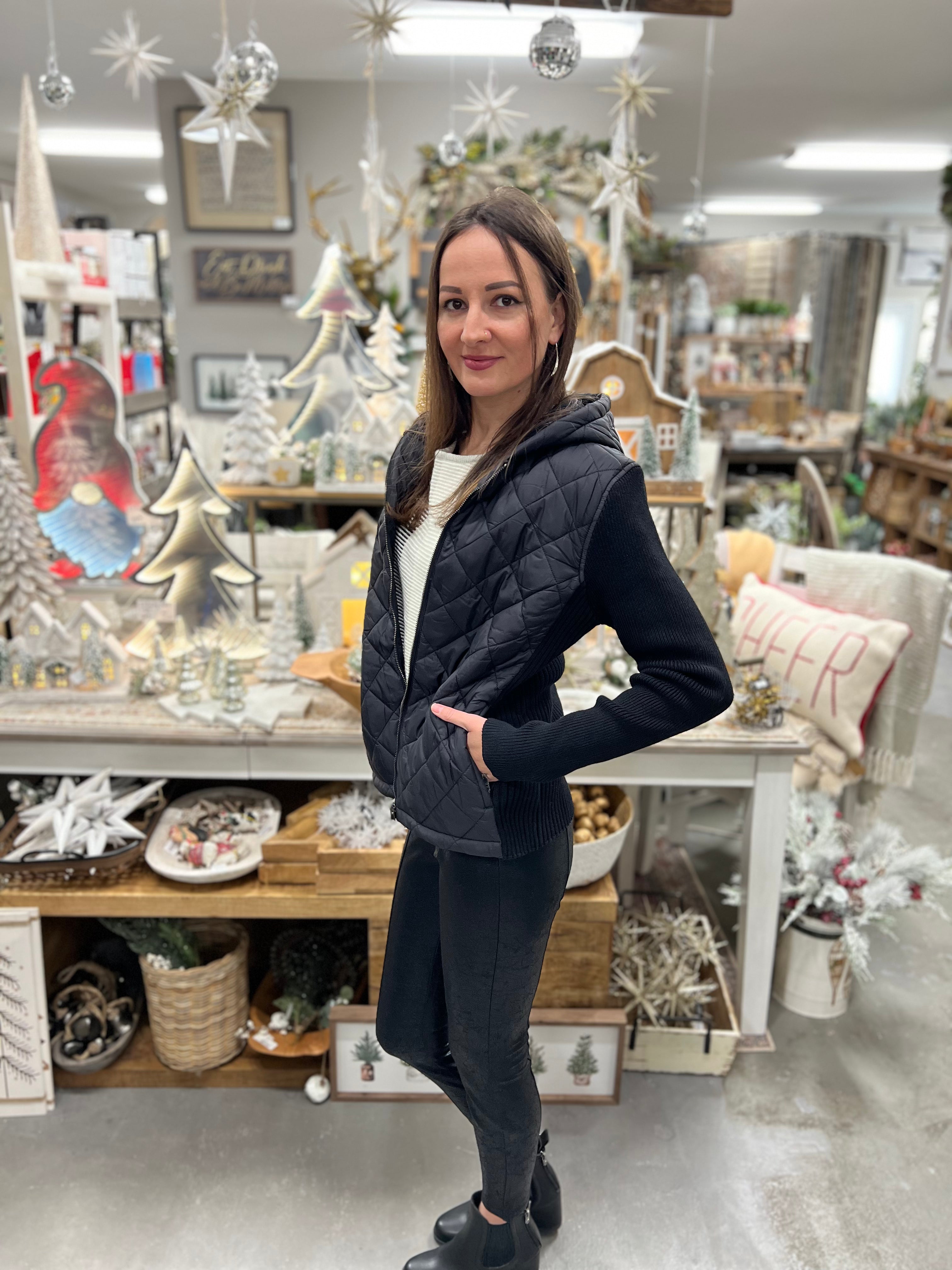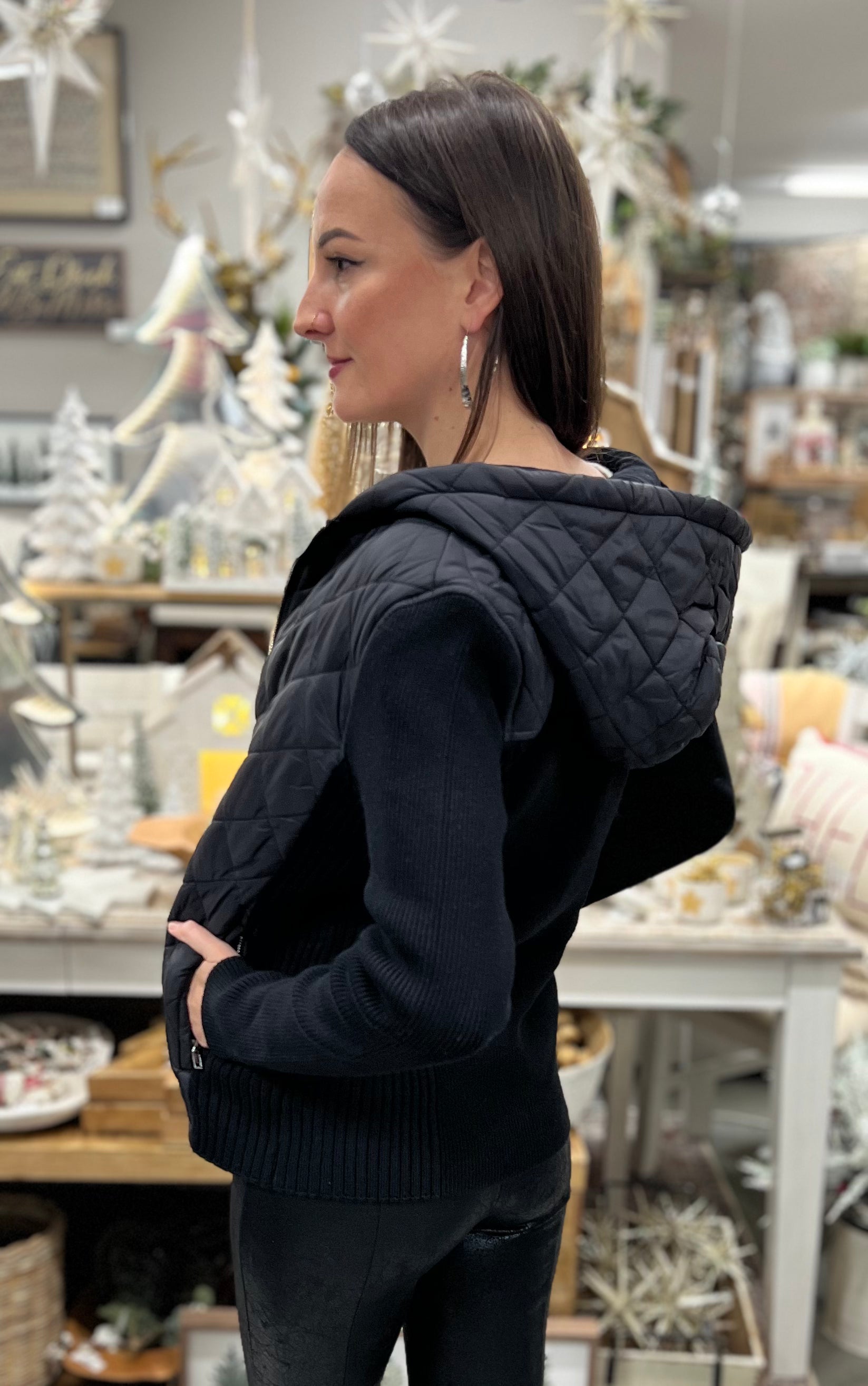 Wrap yourself in chic comfort with this exquisite Long Sleeve Quilted Front Full Zip Hooded Sweater in classic black from LIVERPOOL.