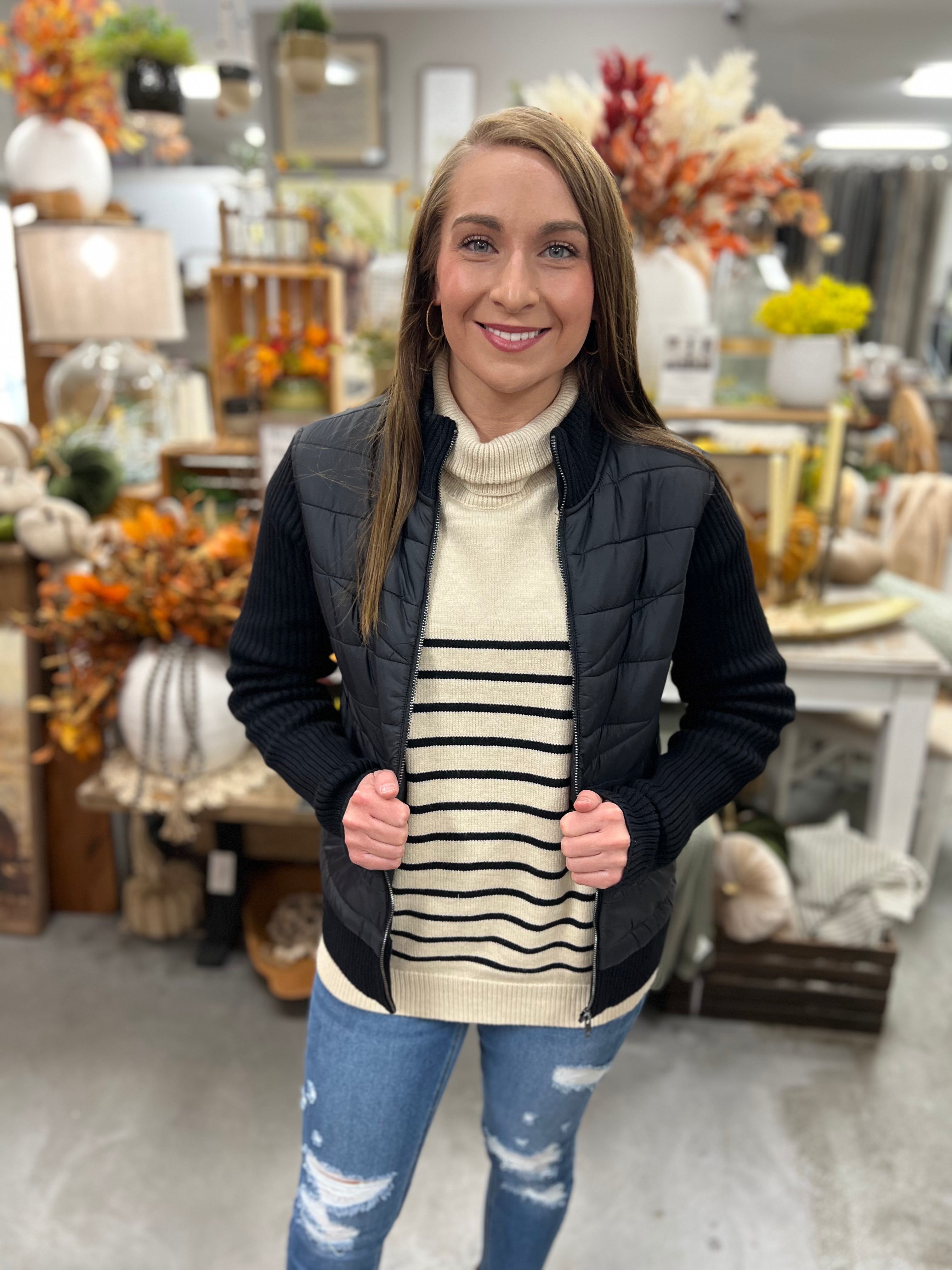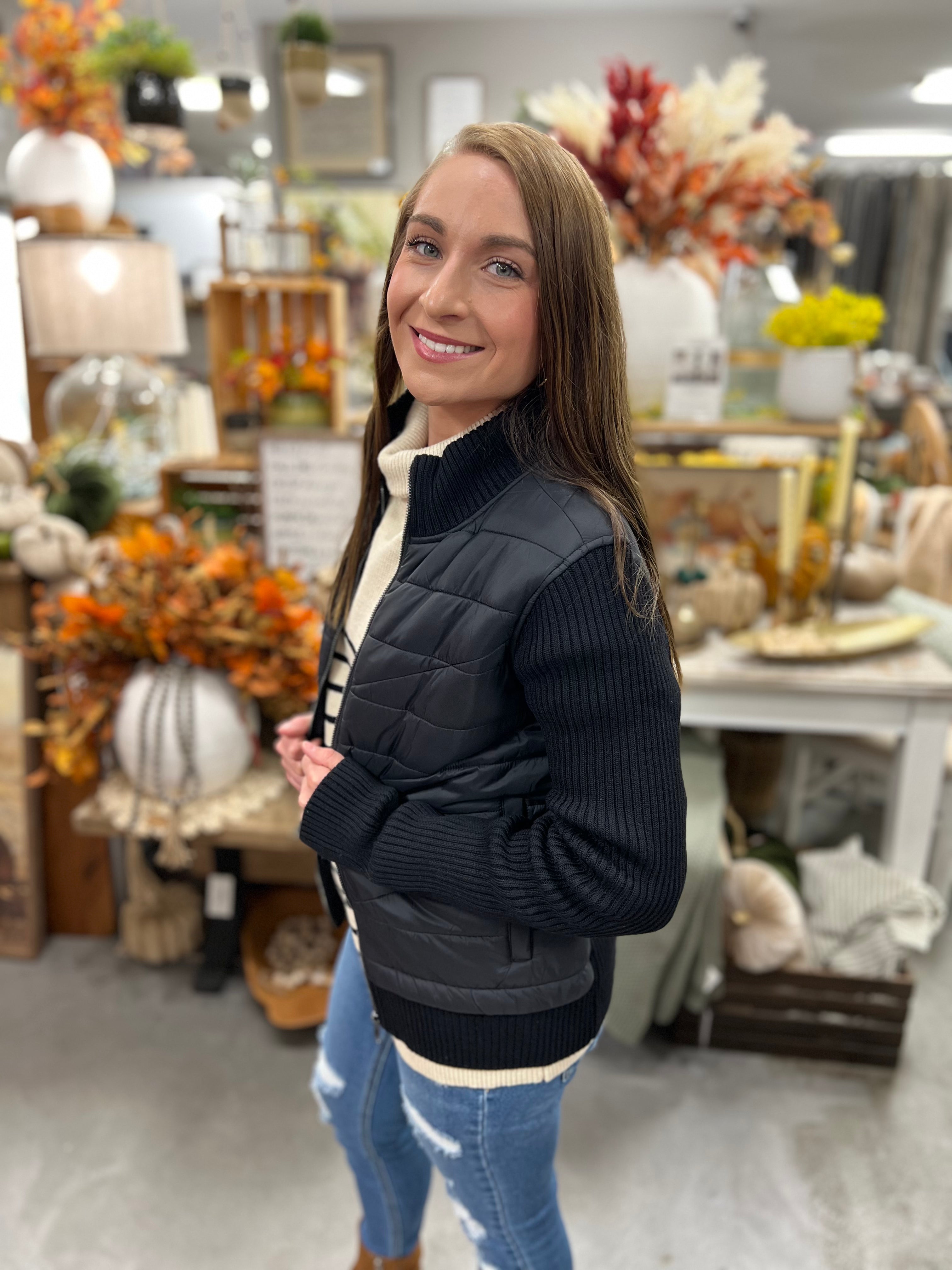 Long Sleeve Quilted Front Full Zip Sweater, Black | LIVERPOOL