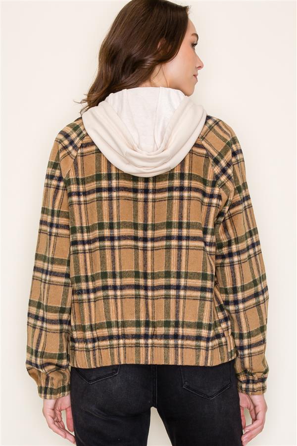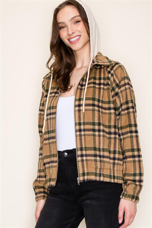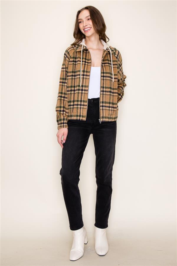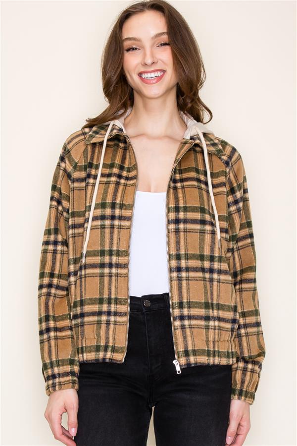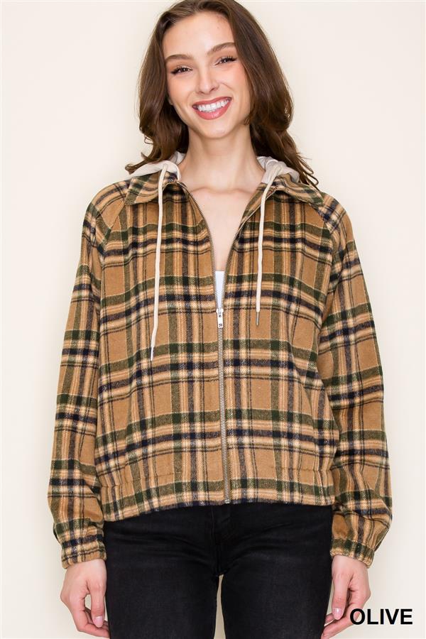 Plaid Hooded Zipper Long Sleeve Jacket w/ Elastic Bottom and Sleeves | Staccato