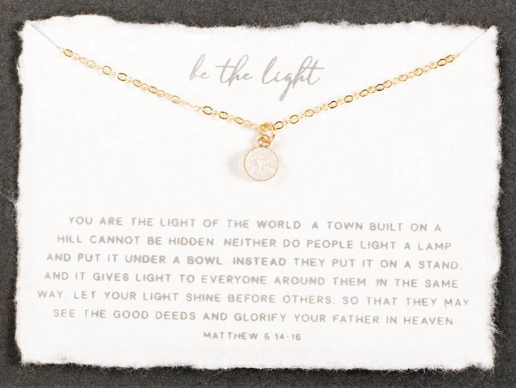 This delicate necklace includes an iridescent mini opal colored druzy set into a precious metal bezel. It is set onto a handmade cotton paper verse card, perfect for gift giving or to keep close by for encouragement.