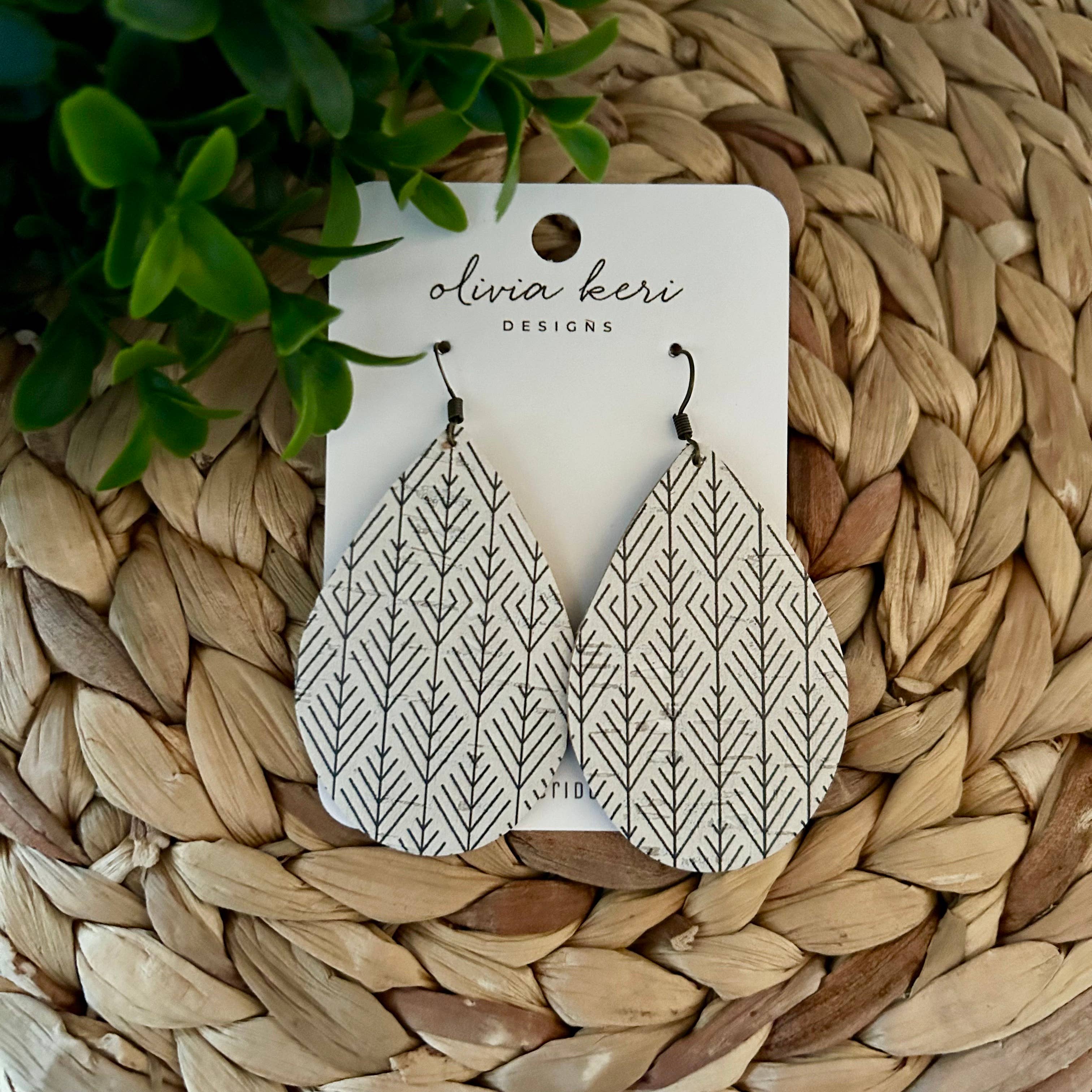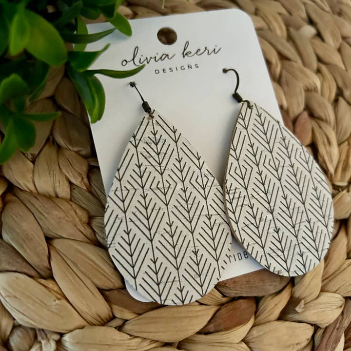 Cork on leather earrings measuring 2.25” x 1.5". Ear hooks add approximately .5 inches in length to the overall design. Gorgeous and lightweight!