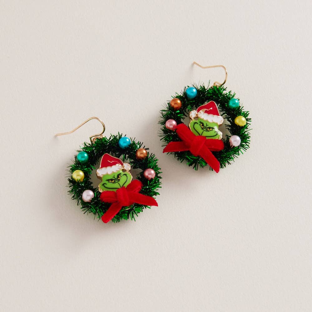 Bring mischievous holiday spirit to your ears with these delightfully quirky wreath earrings inspired by everyone's favorite green grouch.