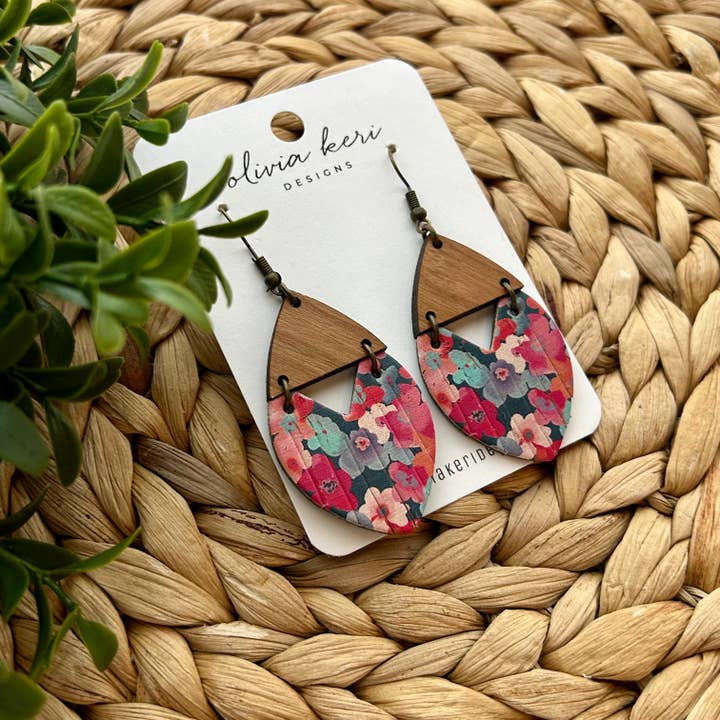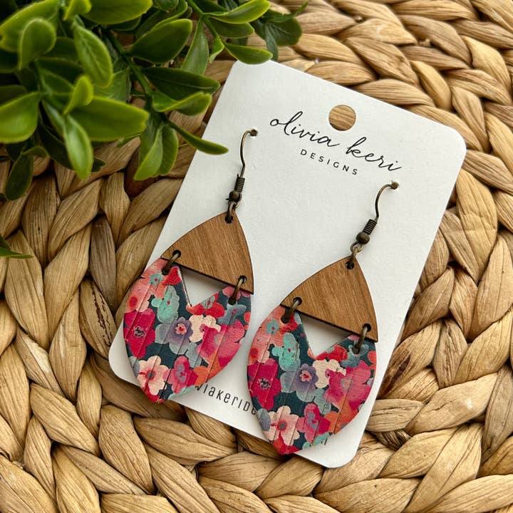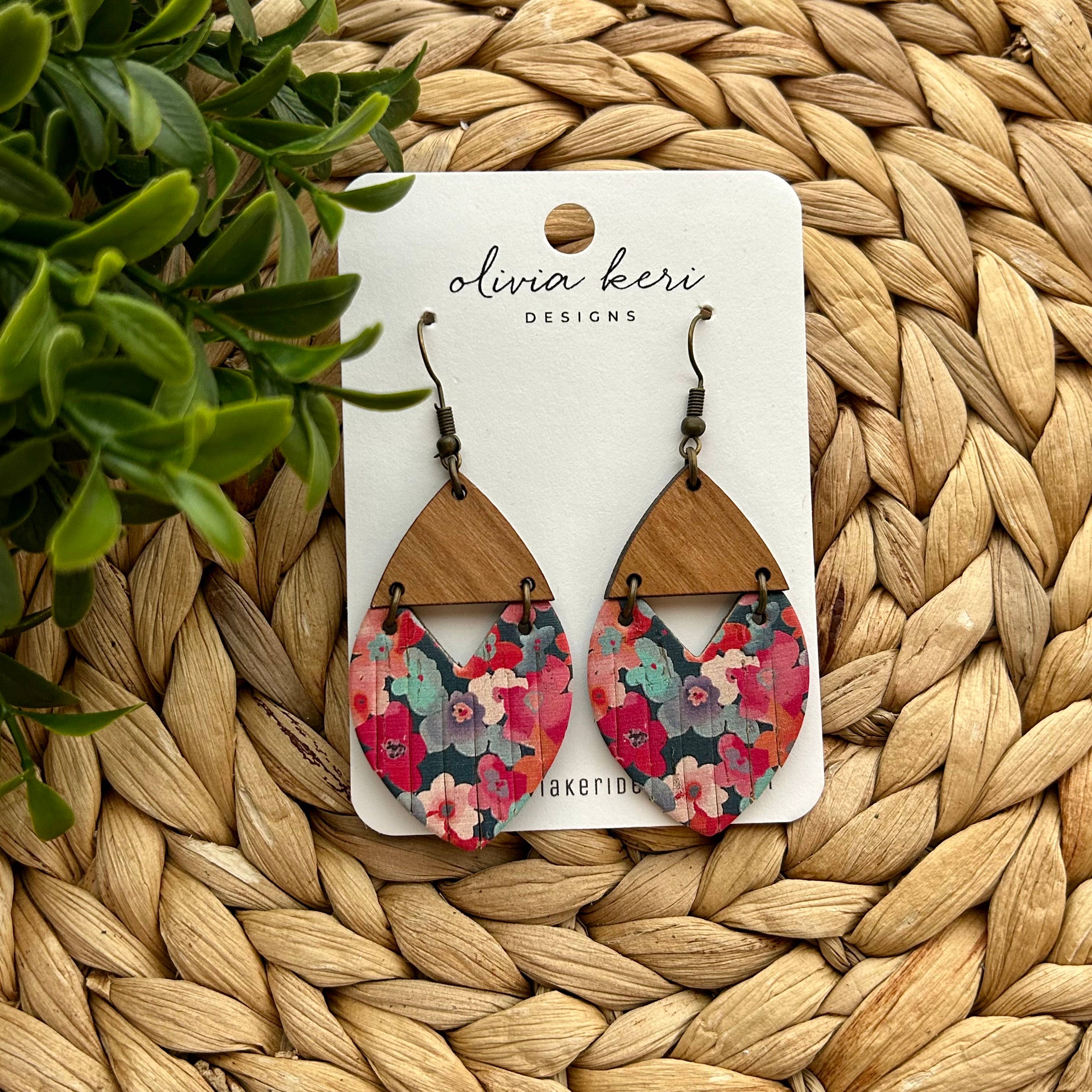 Add a touch of botanical charm to your ensemble with these gorgeous earrings featuring cork and cherry wood accents.