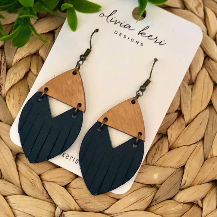 DETAILS *Genuine Leather *Antique Bronze Nickel-Free Wire *Cherry Wood Accent *Rubber Backings Included *Earrings are packaged on a lovely display card.