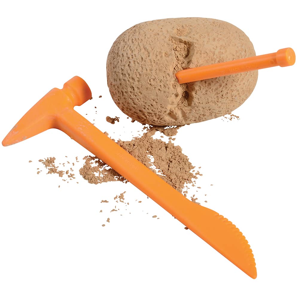The kit includes a 3.5" rock waiting to be unearthed, along with essential tools like a plastic chisel, hammer, and brush for a realistic excavation experience.