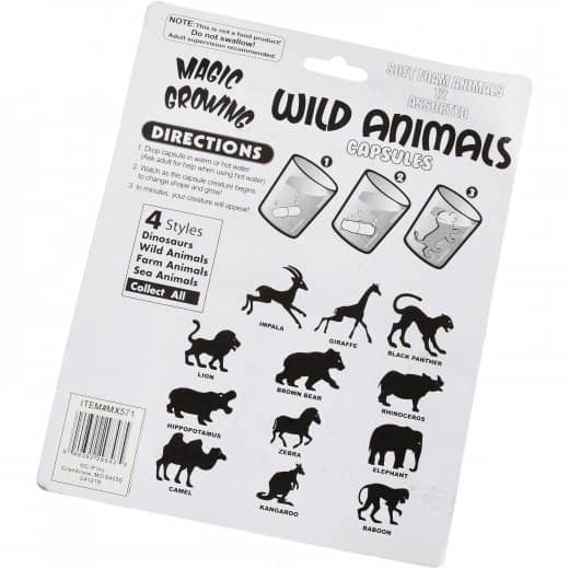 Drop these capsules in warm water and watch wild animals magically appear in minutes! Each 0.75” sponge capsule contains a surprise creature, with 12 assorted styles in every pack.