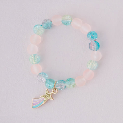 Frosted pink beads dance alongside glittering teal and blue accents, all crowned with a delightful shooting star charm.