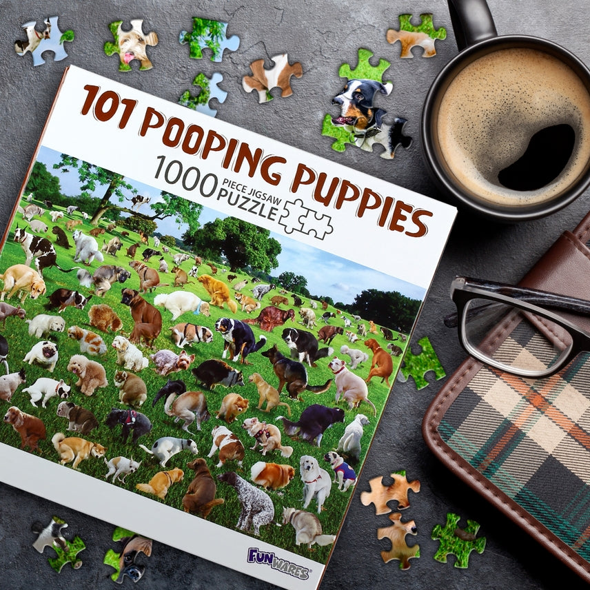 Get ready for hilarity with the '101 Pooping Pooches' 1000-piece jigsaw puzzle!