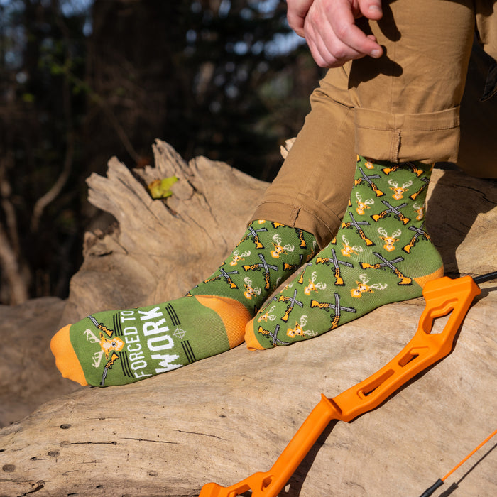 Introducing these dapper crew socks tailored for hunters - the perfect blend of style for both work and hunting expeditions. The socks showcase original, unique art in classic camo colors with a striking deer pattern, coupled with a hidden message sure to bring a smile to any hunting enthusiast: "Born to Hunt, Forced to Work."