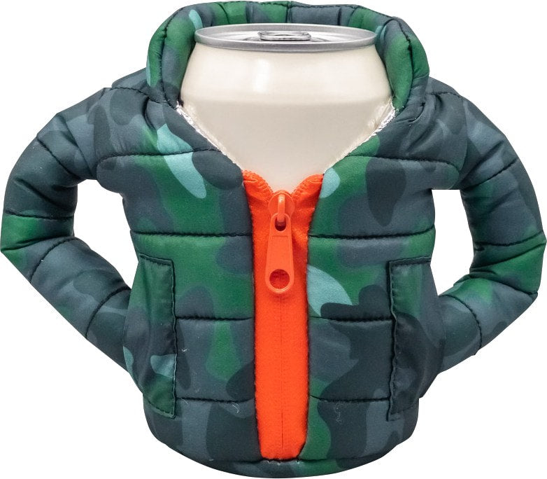 Keep your can drinks cold with this fun coozie. Puffer vest with camo and orange for the outdoors lover.
