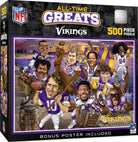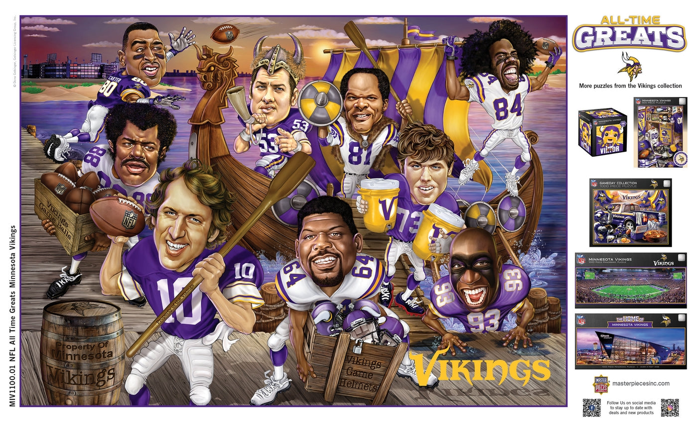 Celebrate your passion for Minnesota Vikings football with this 500-piece jigsaw puzzle featuring vibrant caricatures of Vikings all-time greats in a bold, team-inspired setting.