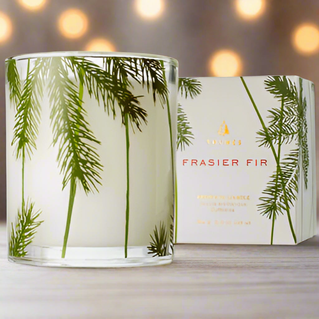 Discover the beloved Frasier Fir in a Boxed Glass Candle, refined addition to any space. Its pristine white wax rests within a clear glass vessel, elegantly accented with fine pine needles.