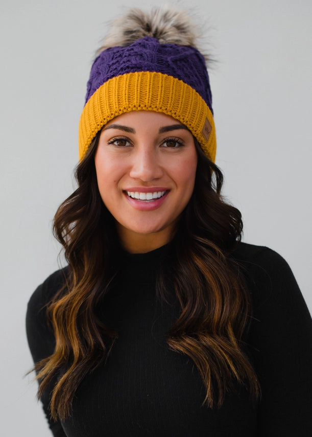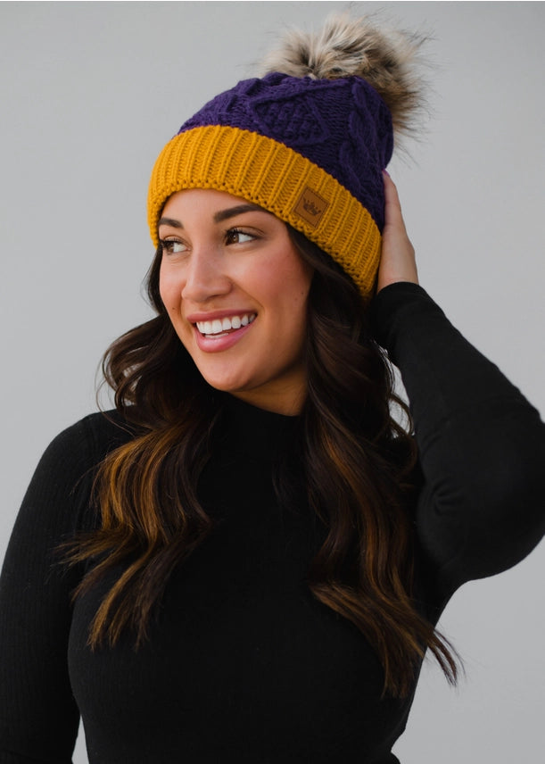 Purple & Gold Trim Cable Knit Pom Hat | Panache