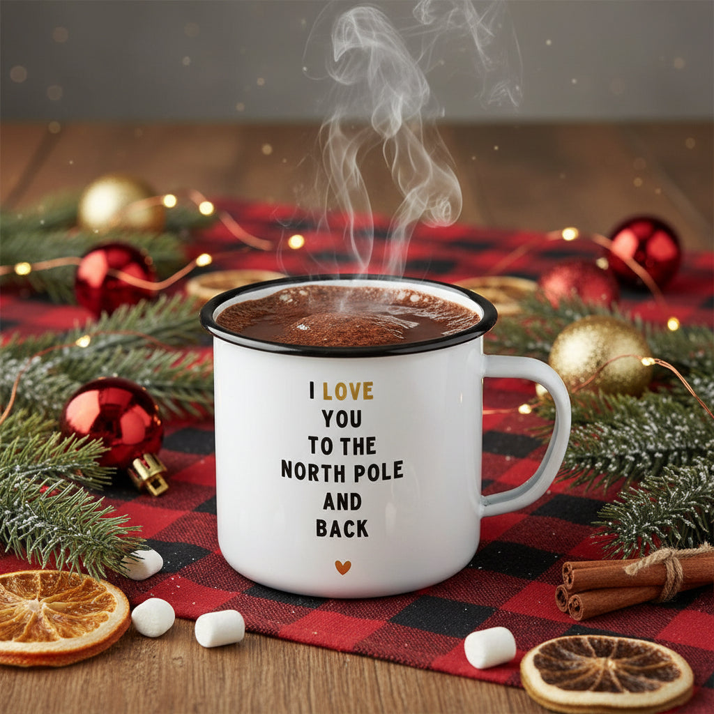 Give the gift of warmth and cheer with this delightful North Pole enamel mug. Whether you're treating your sweetheart or delighting a little one, this festive mug spreads holiday joy with every sip.