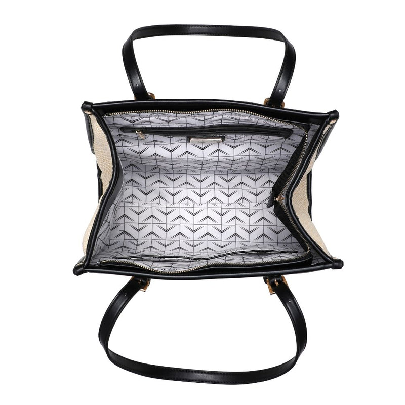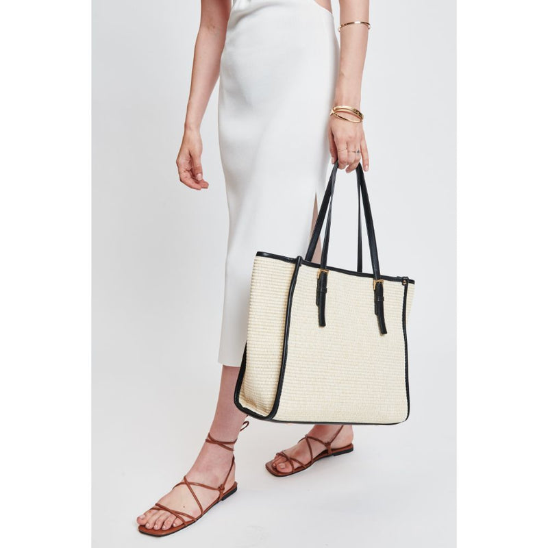 - Exterior Details: Straw All Over, Vegan Leather Trimming, Gold Hardware