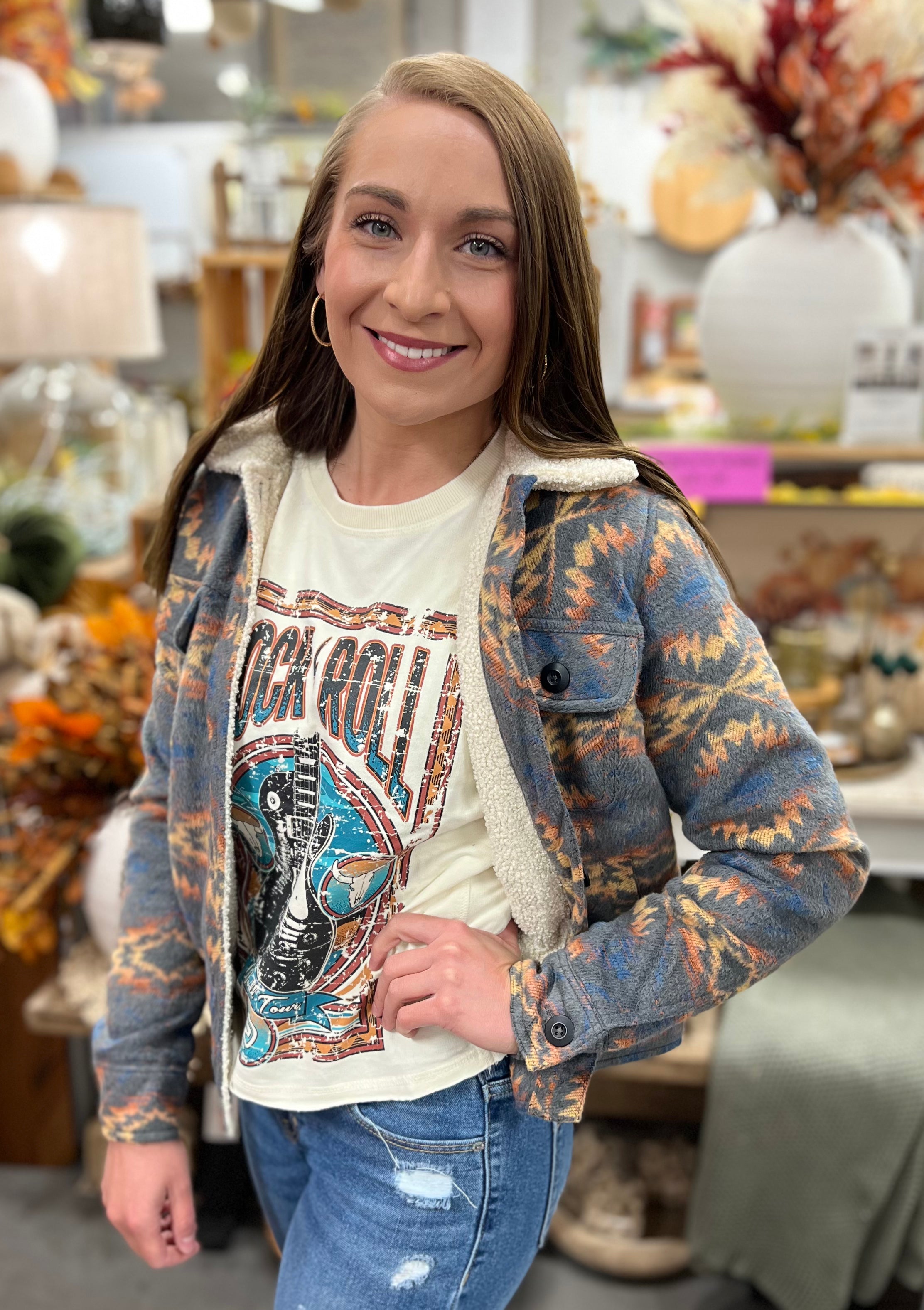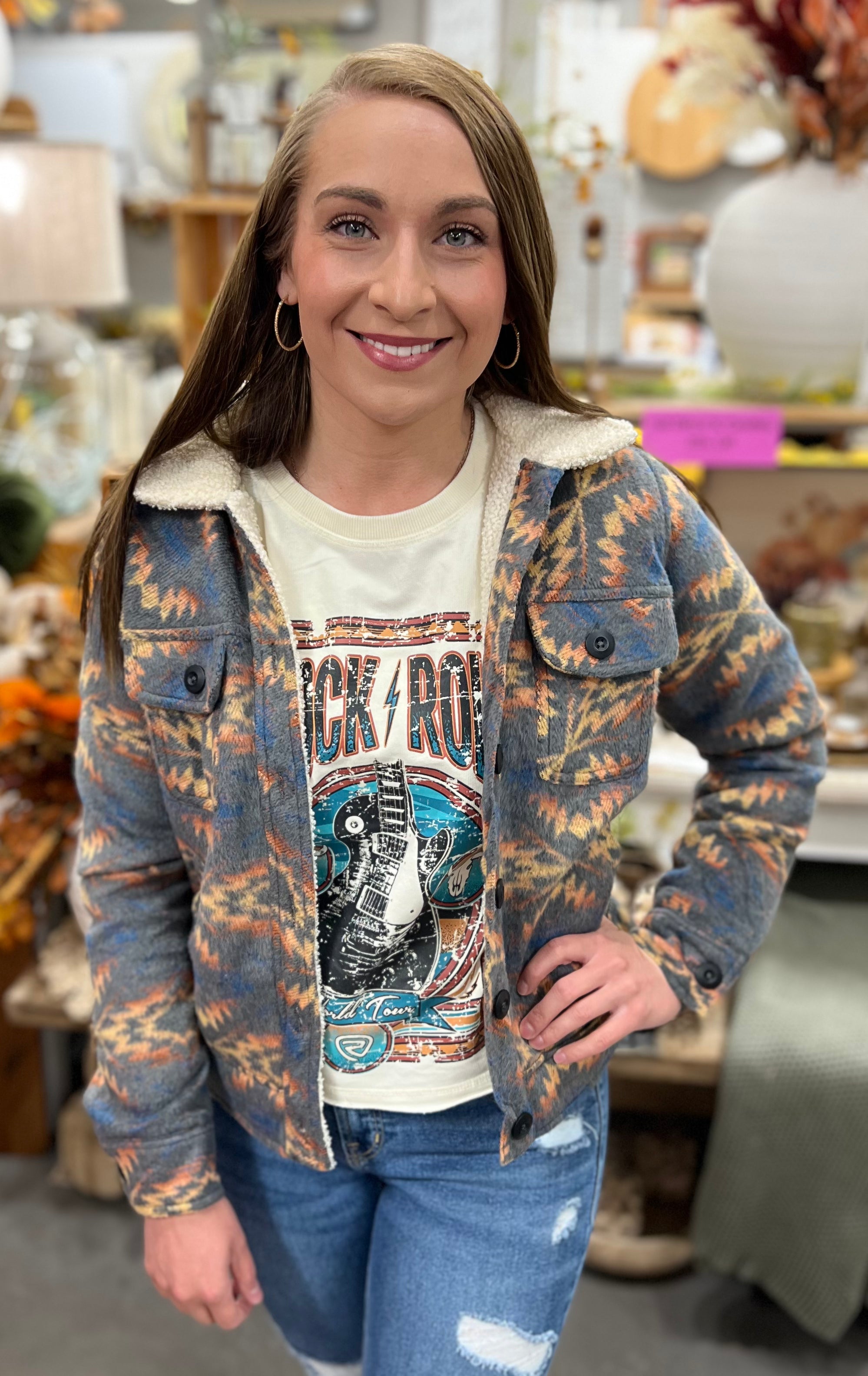 Aztec Short Shacket w Pockets Sherpa Lining, Charcoal, Orange, Yellow | Rock & Roll