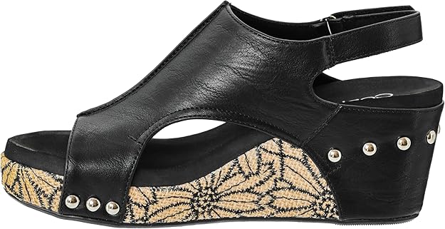 Get ready to rock your summer style game with these bold Carley Wedge sandals! The studded detail adds an edgy touch to the vegan leather upper, while the cushioned neoprene insole and easy Velcro back strap guarantee comfort all day long.