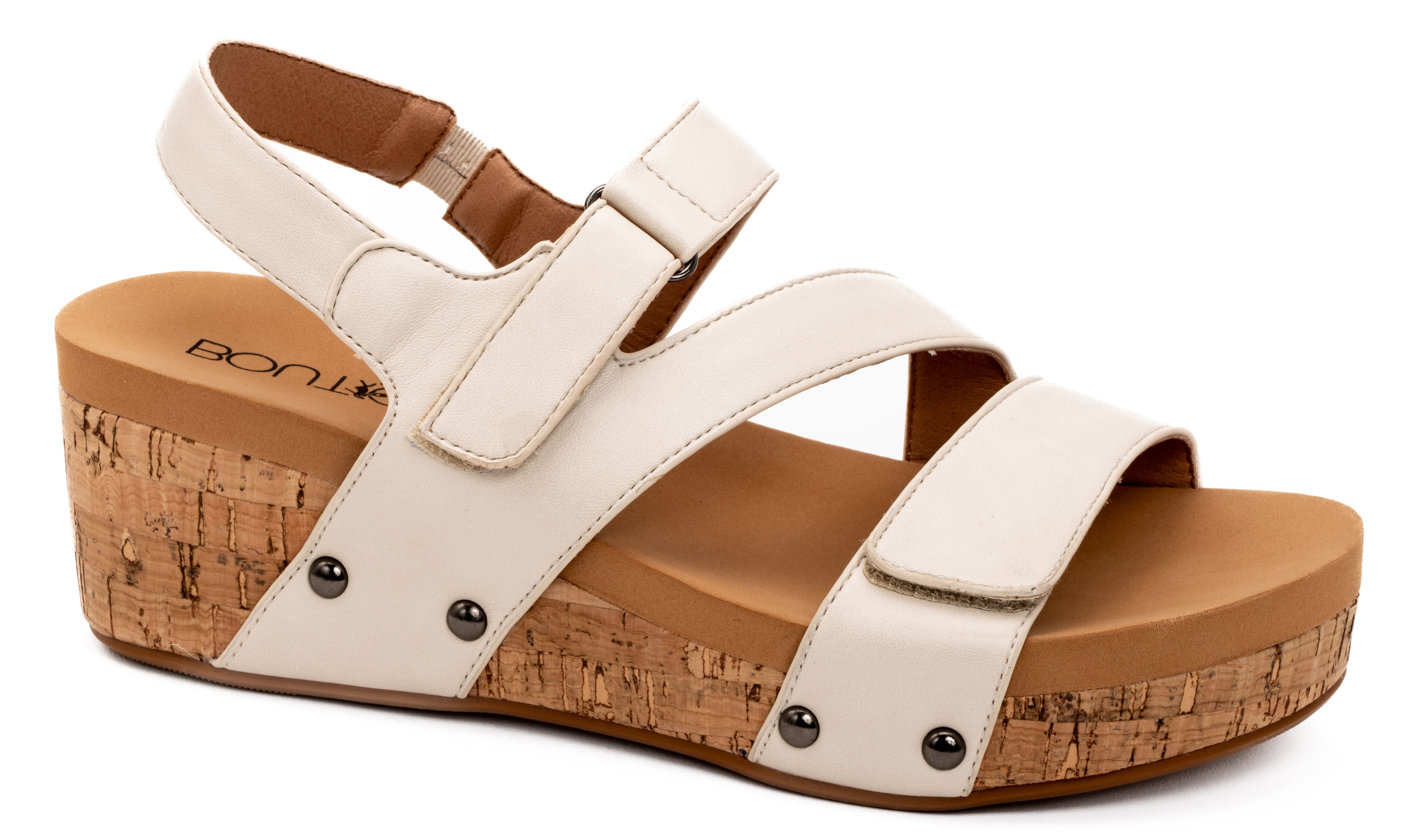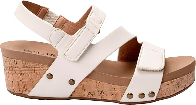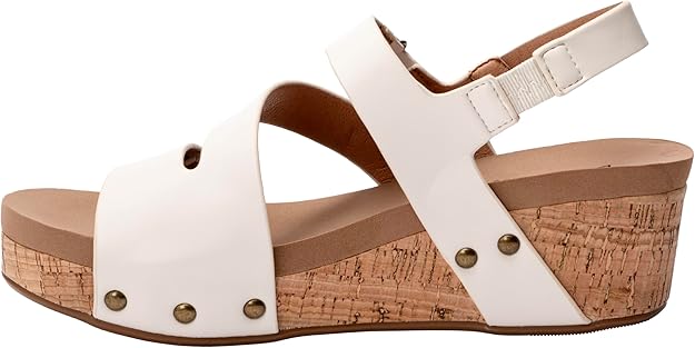 These Rain Check low wedge sandals from Corkys have vegan leather straps and cork detail on the sole. The stud details and fun strap design give these a unique style, and the Velcro closure on the ankle strap makes them easy to put on and take off. Plus, the top strap is adjustable, too.
