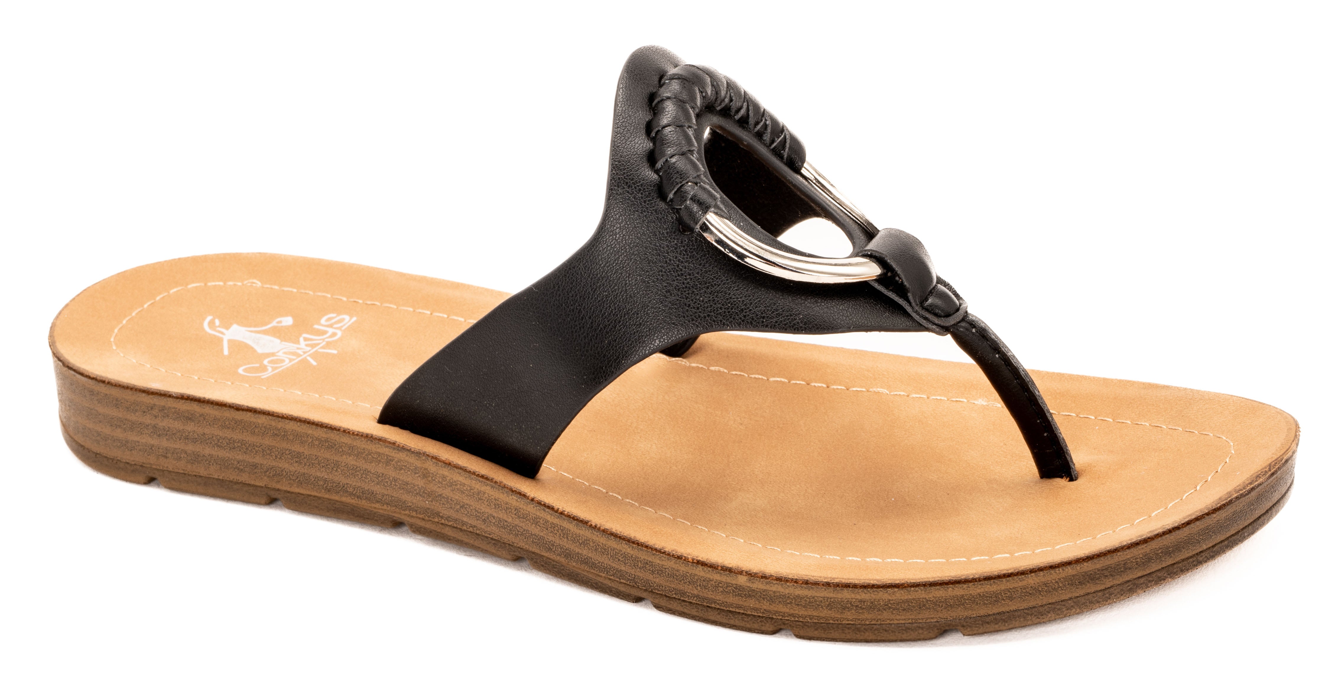 This elegant Corkys Ring My Bell sandal showcases sophisticated cut-out detailing around a striking metal ring, delivering both trendy style and visual interest.