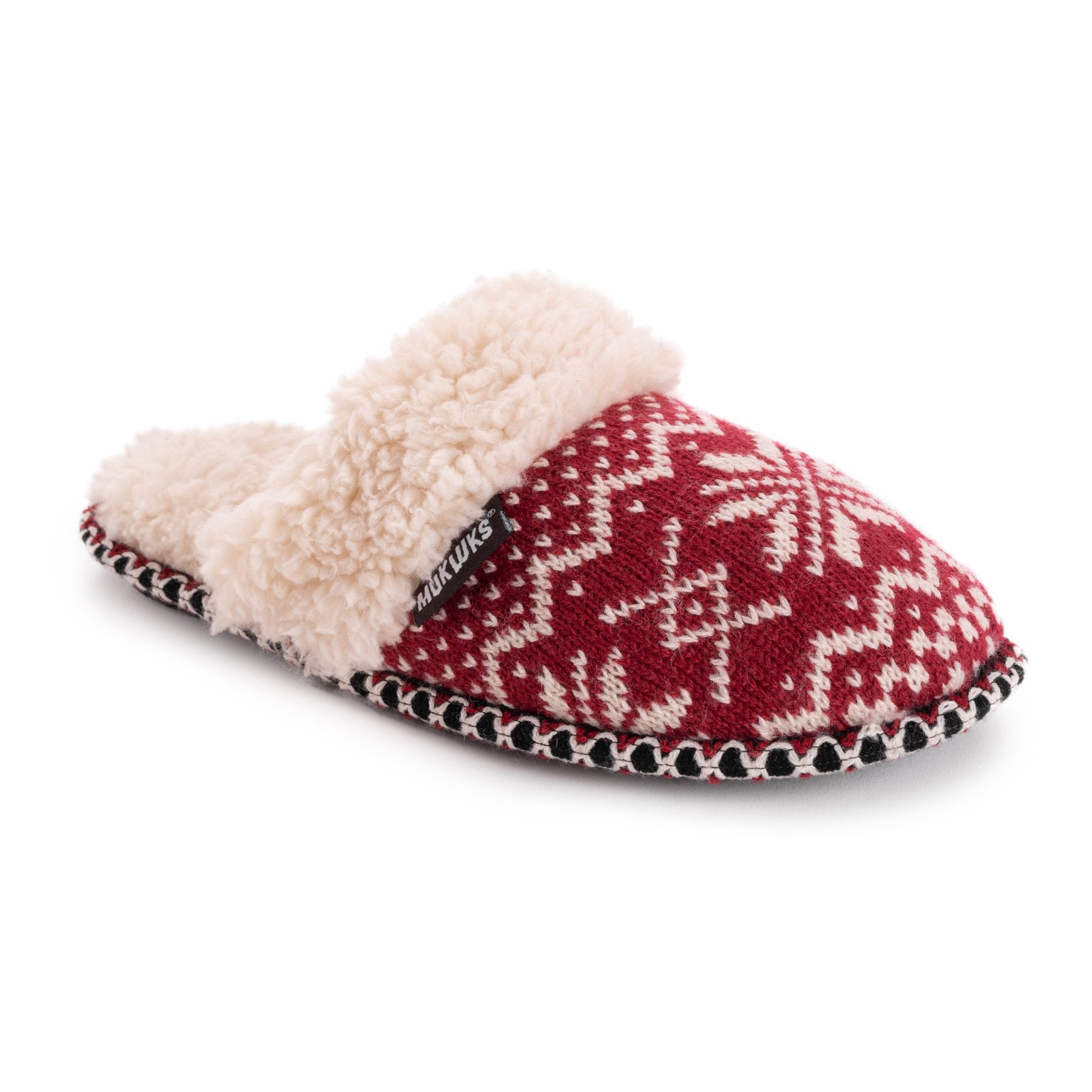 Soft & cozy slip on slipper. Great for chilly days. Festive red & white nordic pattern on top with plush faux fur interior.