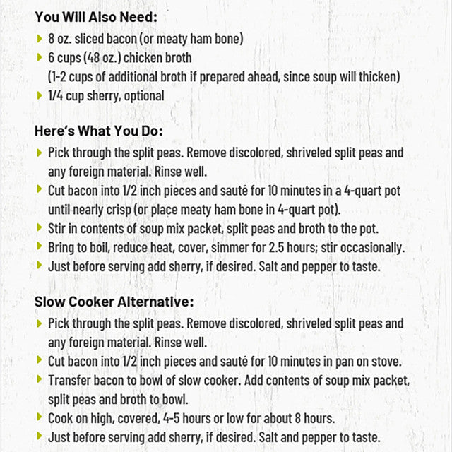 Nebraska Barnraising Split Pea Soup features seasoning and a carrot vegetable mixture that complement the finest green split peas. Bacon or ham are popular additions to this classic thick split pea soup. Add a dash of sherry, if desired!