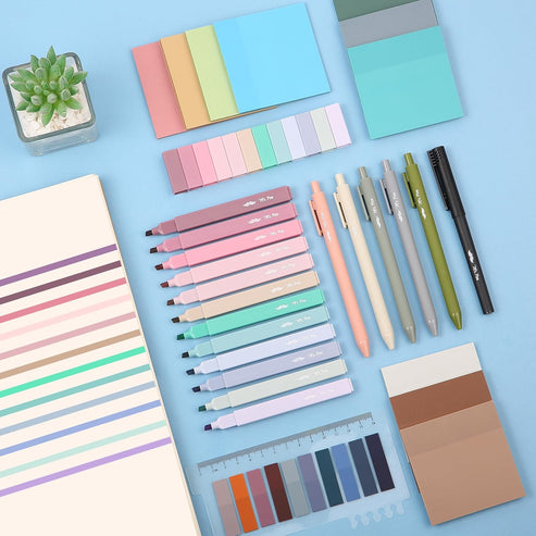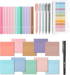 The kit features 12 pastel-colored highlighters, 5 black ink gel pens, and 1 fine-tip marker, perfect for highlighting, underlining, and making notes with precision. It also includes 10 different colors of 3" x 3" sticky notes, with 50 sheets per color, allowing you to add colorful annotations, reminders, and notes directly to your books or documents.