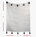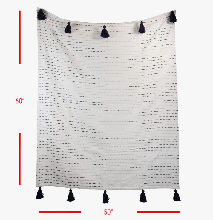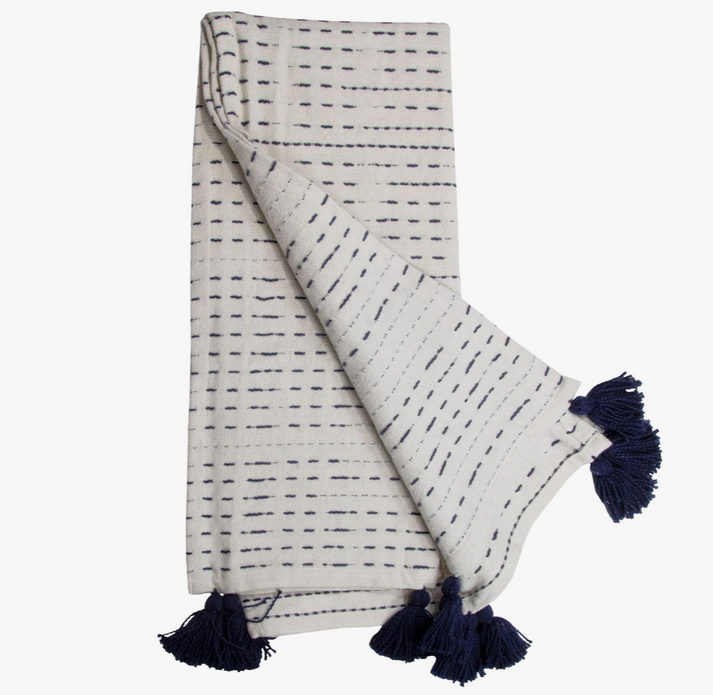 Hand woven by artisans in India, a natural woven cotton base with a blue dash and dot pattern and large corner tassels, make this throw a unique addition to the sofa or bed.