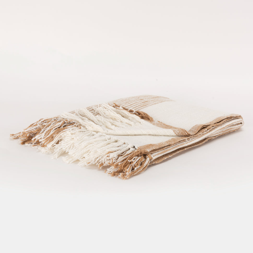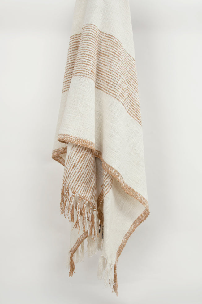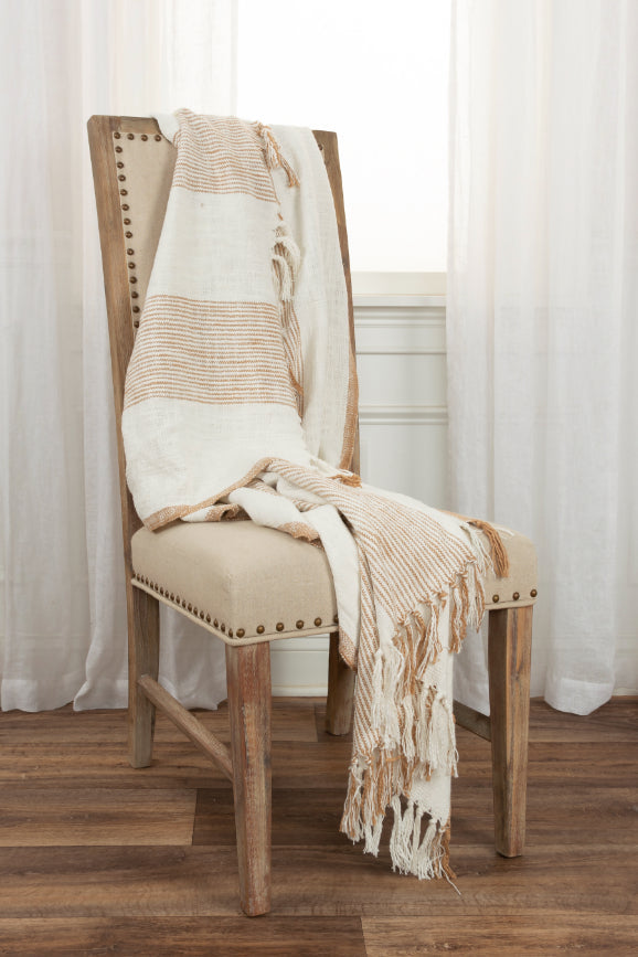 Woven of cotton yarns to creates a slubbed crafted boho look on this striped throw, which are woven into this piece. This ivory and camel striped throw from Rizzy Home is hand tied creating tassels at both ends of this throw. Completed, this throw is washed using special techniques that result in a wonderfully soft hand.
