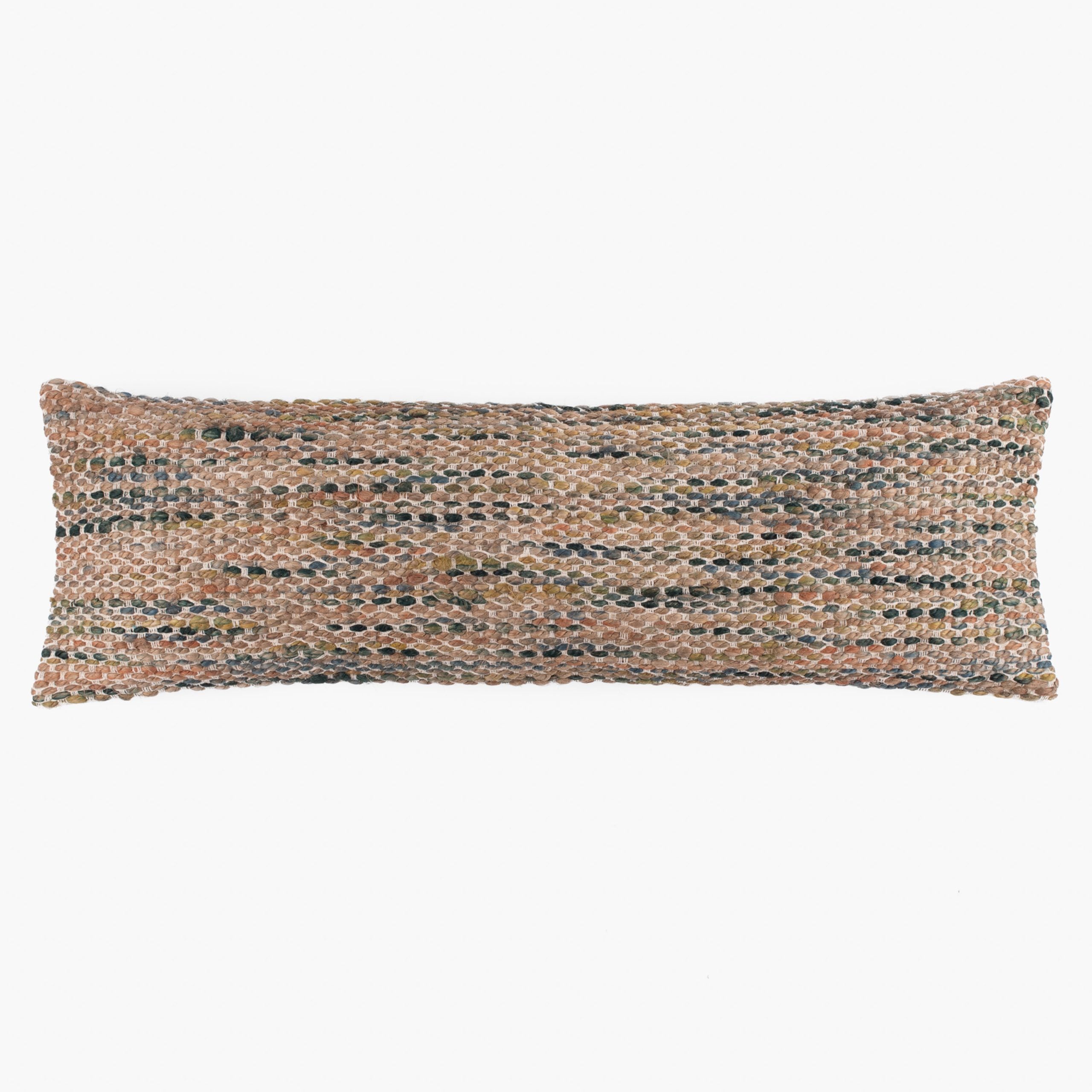 Artfully handwoven with a rich blend of earthy tones, this extra-long lumbar pillow adds warmth and dimension to any luxury bedding ensemble. Its intricate, textural weave evokes the charm of artisanal craftsmanship while offering a sophisticated palette of terracotta, olive, and deep charcoal. A versatile accent for refined interiors, it brings an elevated, organic touch to both rustic and modern spaces. Dimensions: 14 x 42
