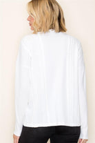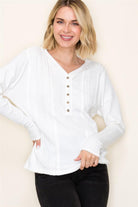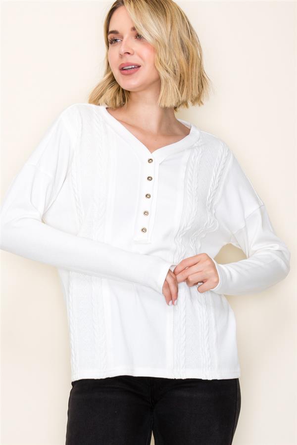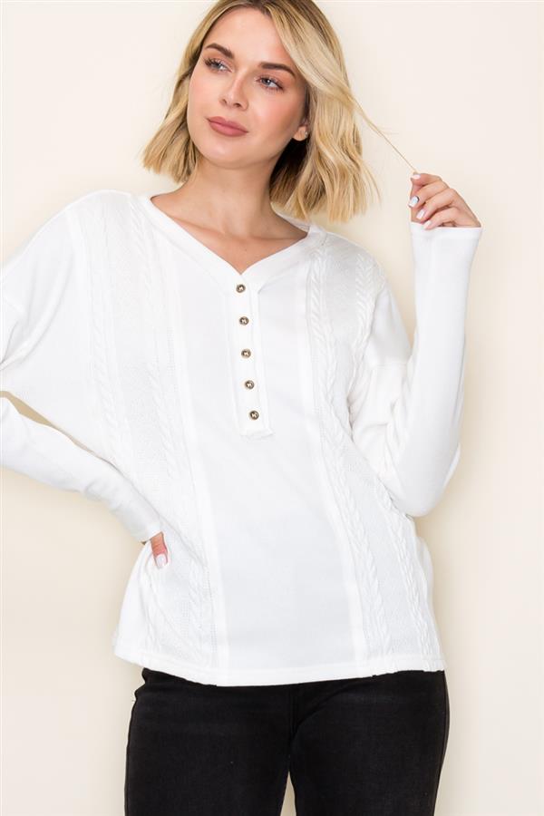 V-Neck Henley Button Long Sleeve Cable Knit Top, Ivory | Staccato