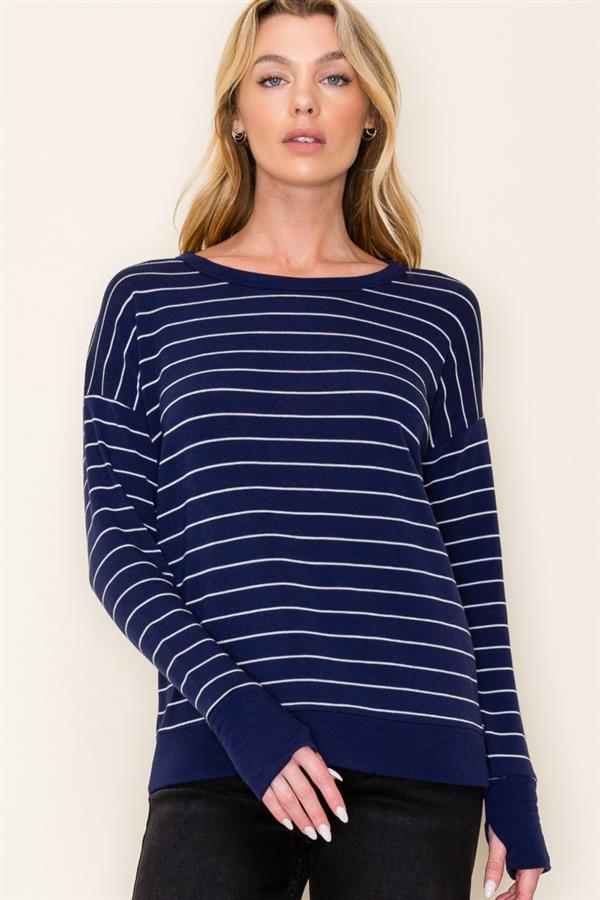 Striped Round Neck Long Sleeve Top, Navy | Staccato - SALE