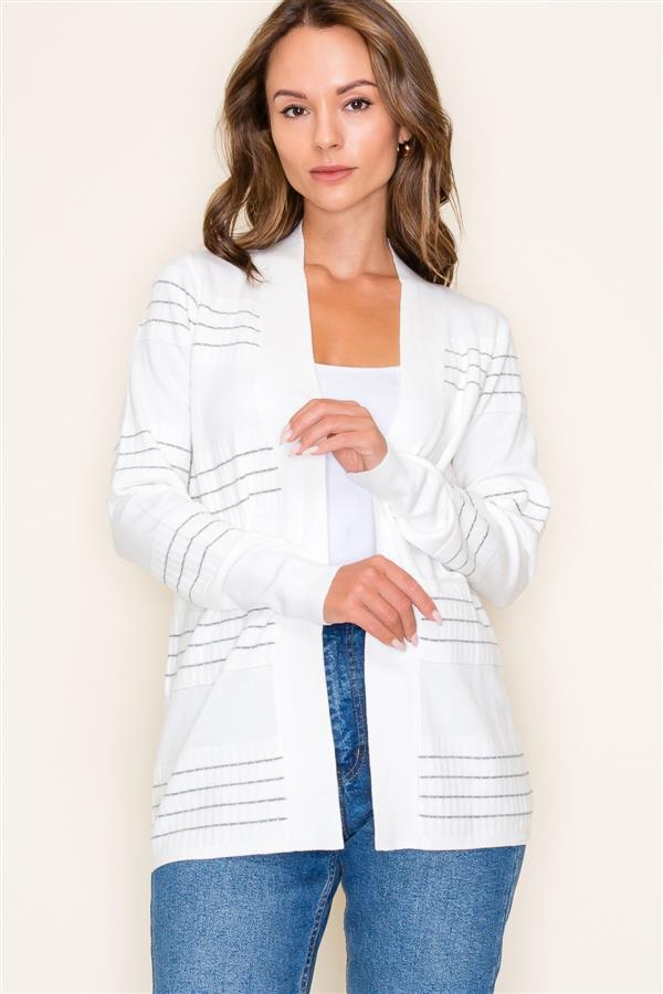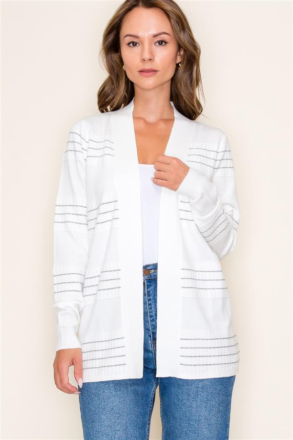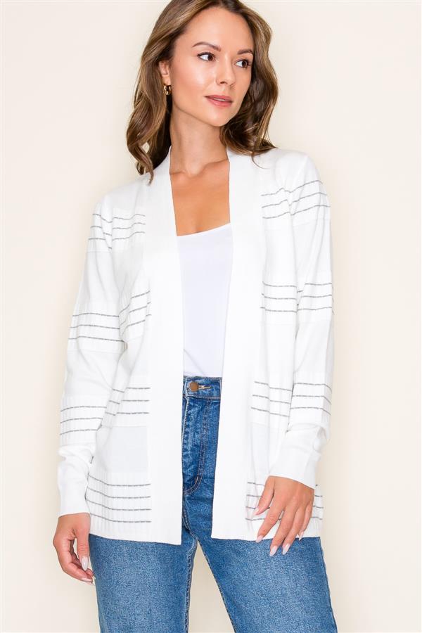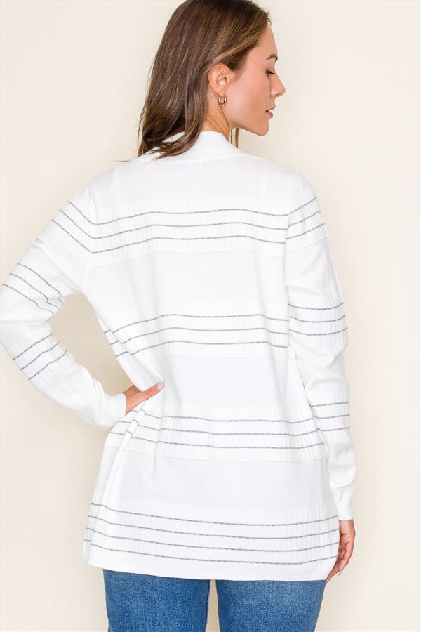Stitch Striped Long Sleeve Open Front Cardigan, White and Grey | Staccato
