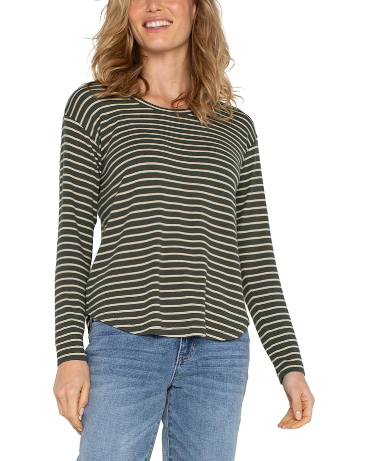 Long Sleeve Drop Shoulder Scoop Neck Stripe Top, Moss Green | LIVERPOOL - SALE
