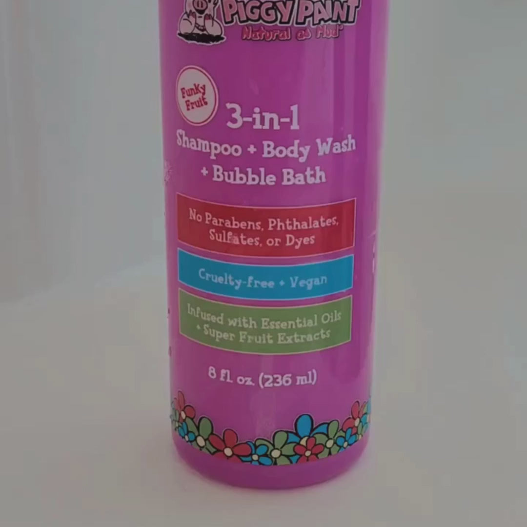 Make bath time a breeze with Piggy Paint 3-in-1—a gentle Shampoo, Body Wash, and Bubble Bath all in one magical bottle! Bursting with a yummy Funky Fruit scent, this multitasking must-have is perfect for busy parents and happy kiddos.