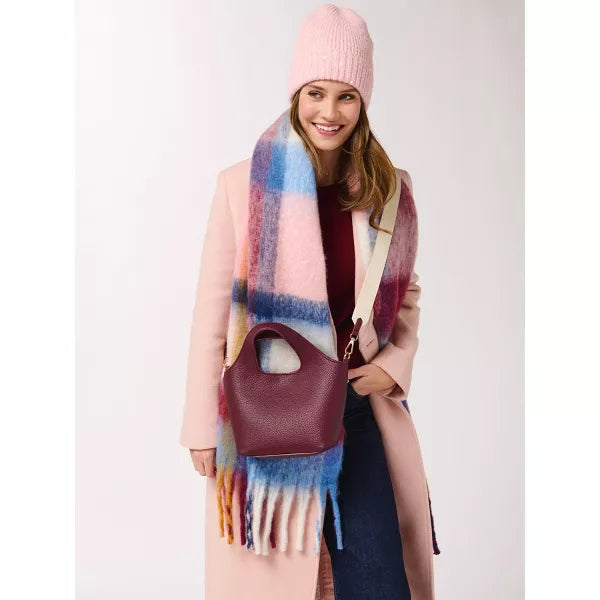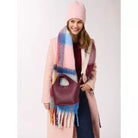 This oversized accessory features a vibrant mix of blue and multicolored squares that instantly elevates any outfit.