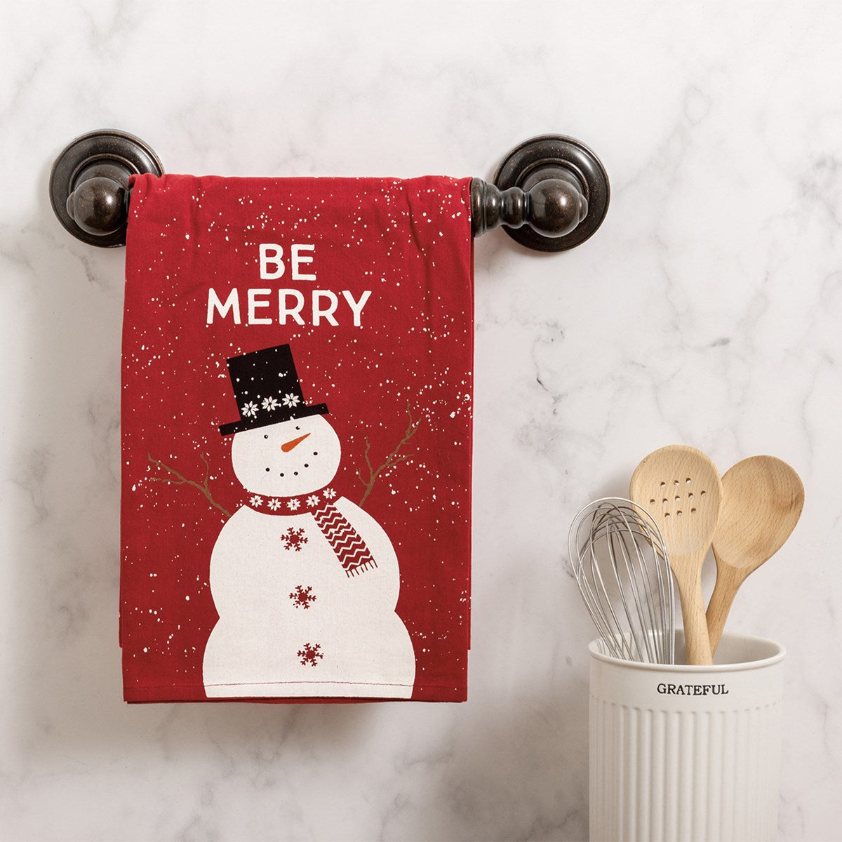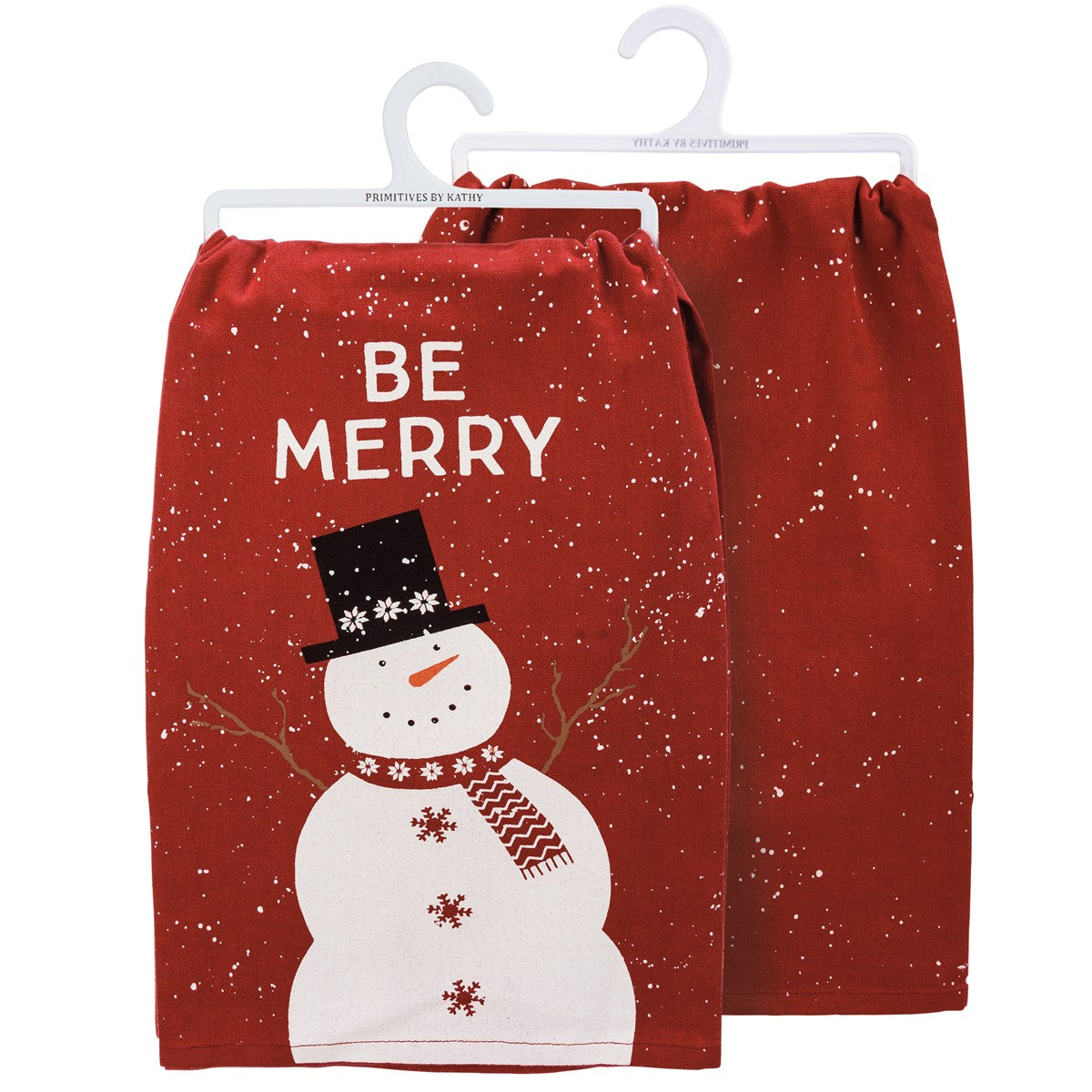 Welcome the holiday season into your home with this luxurious and artful Be Merry Snowman Kitchen Towel in vibrant red.
