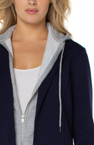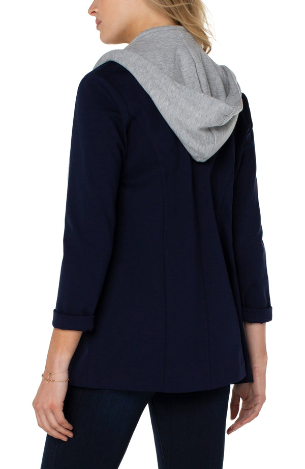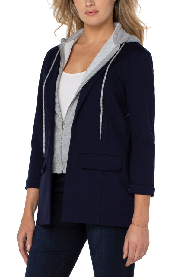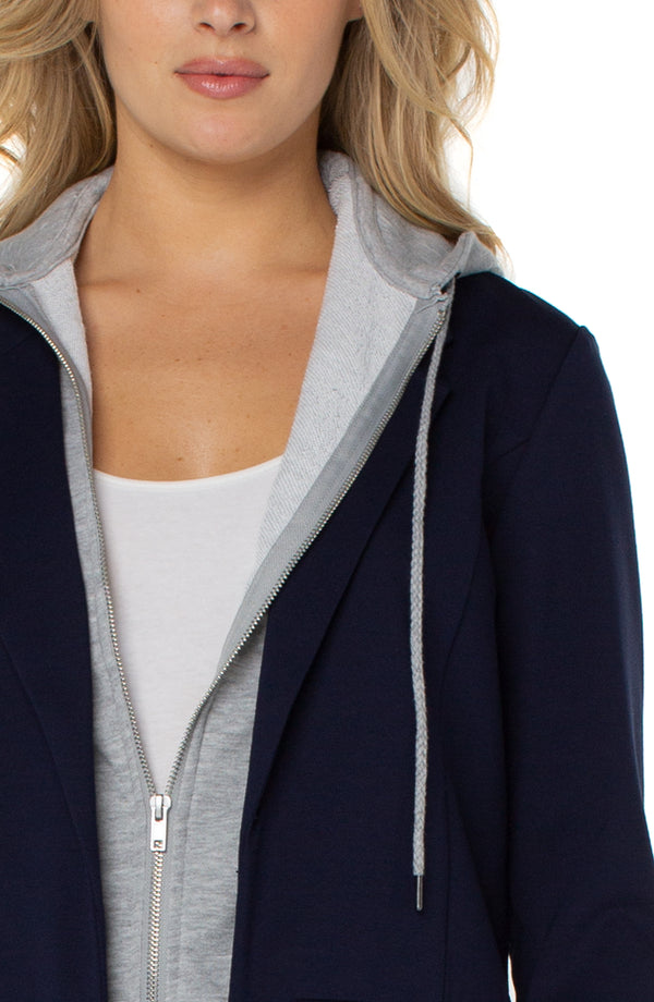 Talk about versatility! The two-in-one fitted blazer with removable hood. Casual Fridays to night out is just a zip away!