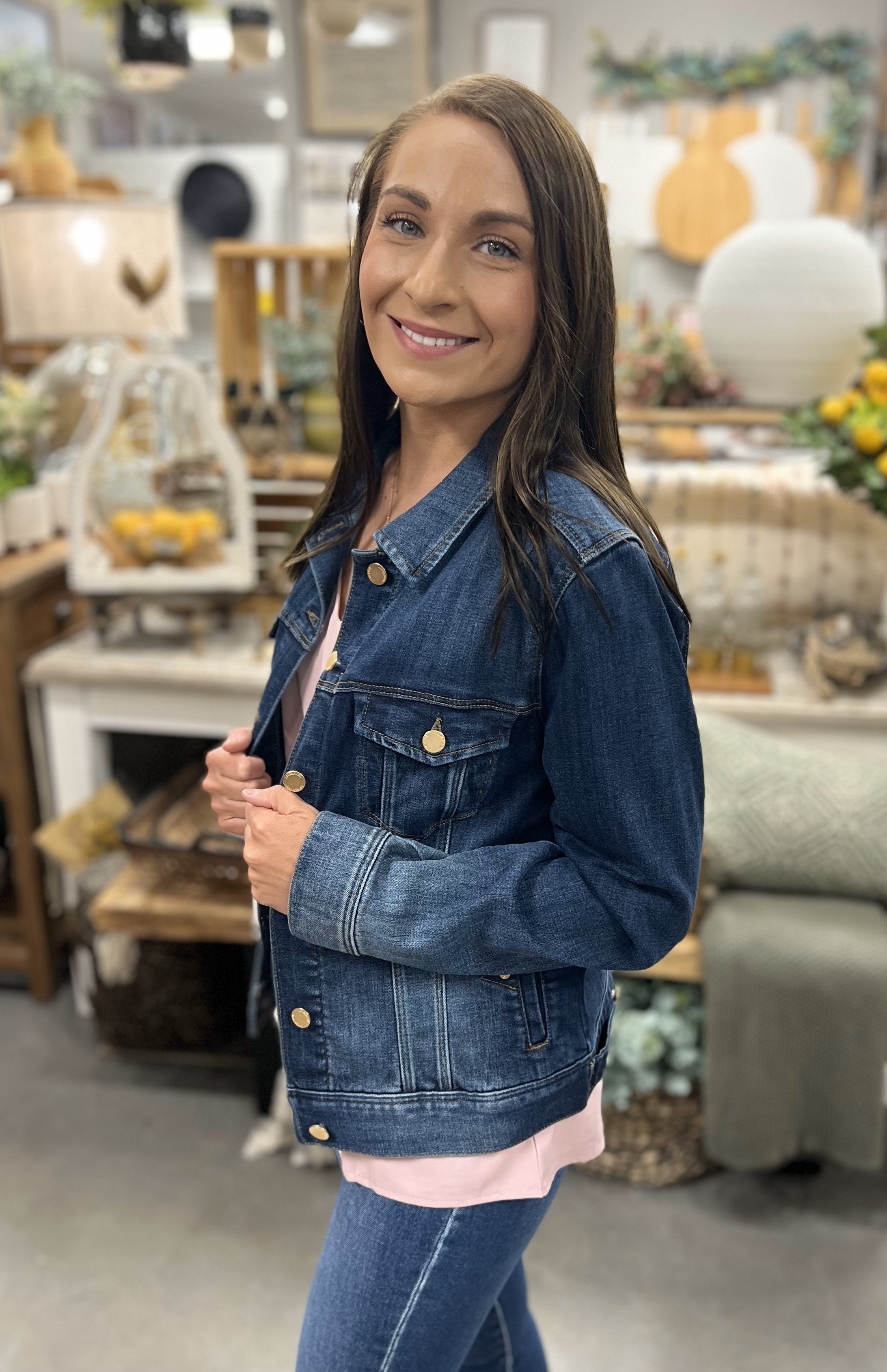 This Classic Jean Jacket from LIVERPOOL Los Angeles features a distinctive Glenrock denim wash with unparalleled comfort and stretch.