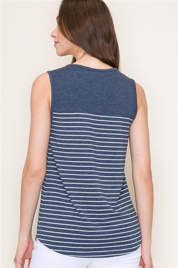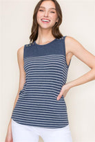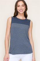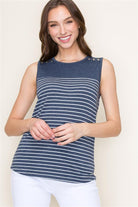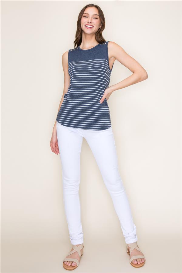 Crew Neck Button Shoulder Tank Top, Navy & White | Staccato