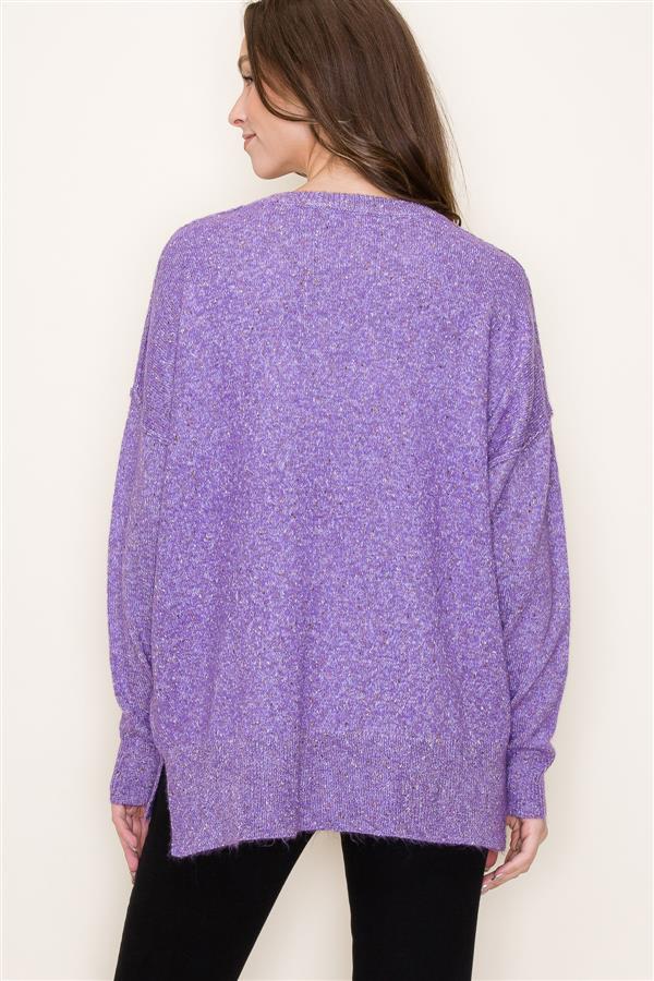 Cozy oversized sweater with multi-colored fleck. Front chest pocket.