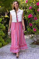 Think of this white denim vest as the perfect statement piece for the season! Layer this cropped piece over a dress or wear with your favorite pair of jeans. The possibilities are endless.