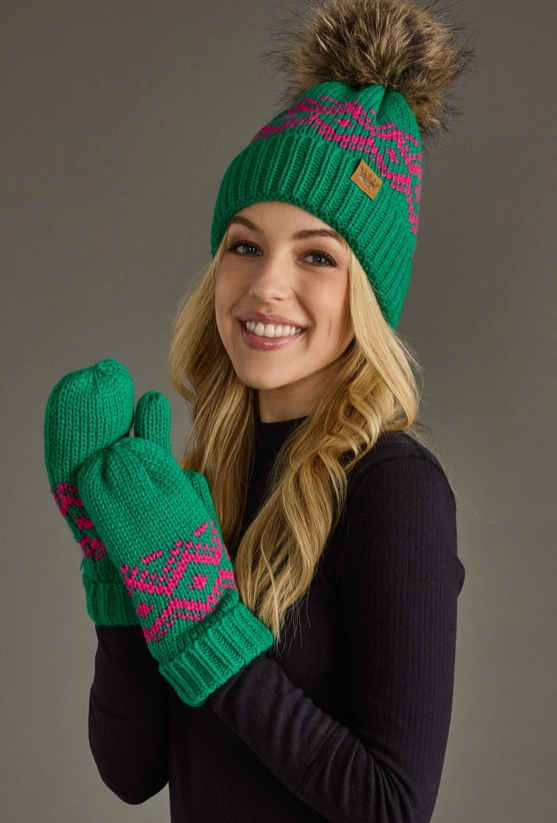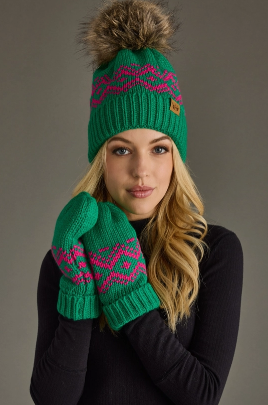 Stay bold this season with these Green & Pink Patterned Knit Mittens from Panache. The striking color-block design makes a fearless statement while keeping your hands warm and cozy.