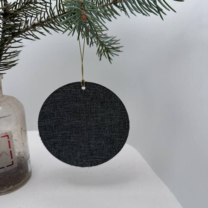 Measuring 3.75" across, it features a witty design on the front with a charcoal grey canvas back, suspended from a gold string.