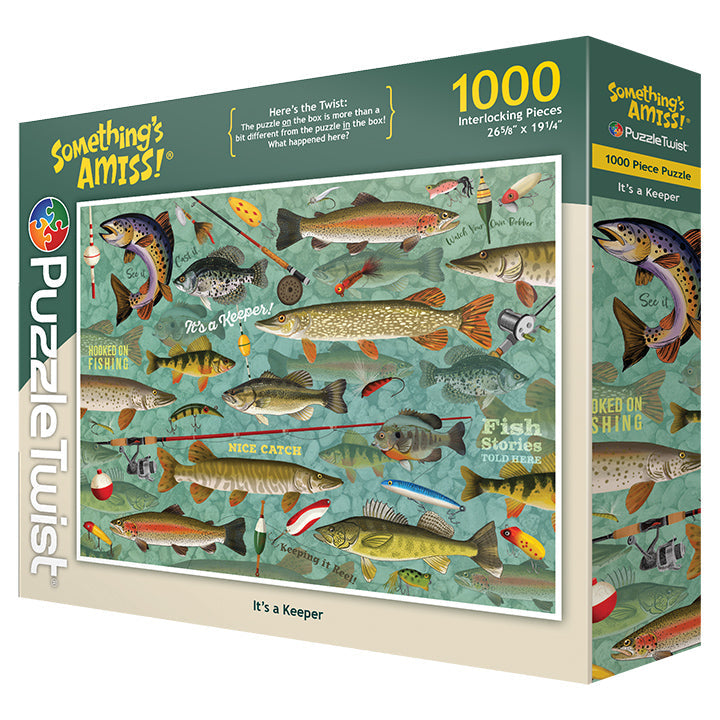 This 1000 pc Puzzle Twist puzzle, titled "It's a Keeper," showcases a vibrant mix of fish and lures. Enjoy the challenge of assembling 1000 unique pieces while admiring the beautiful aquatic scene. Perfect for puzzle enthusiasts and fishing lovers alike.