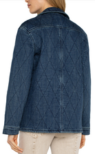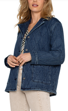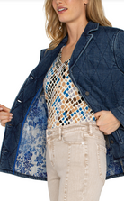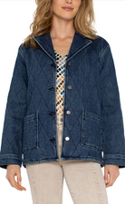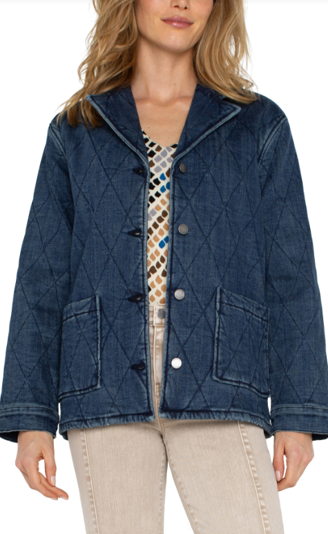 This weighted Notch Collar Quilted Denim Coat from LIVERPOOL Los Angles features a stylish notch collar and a button-up design, adding an elegant touch to any outfit.