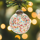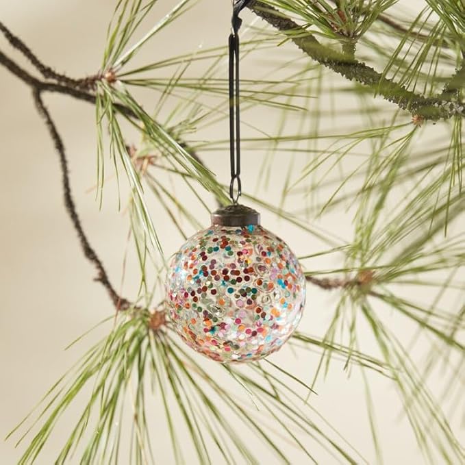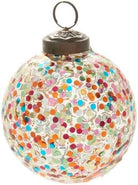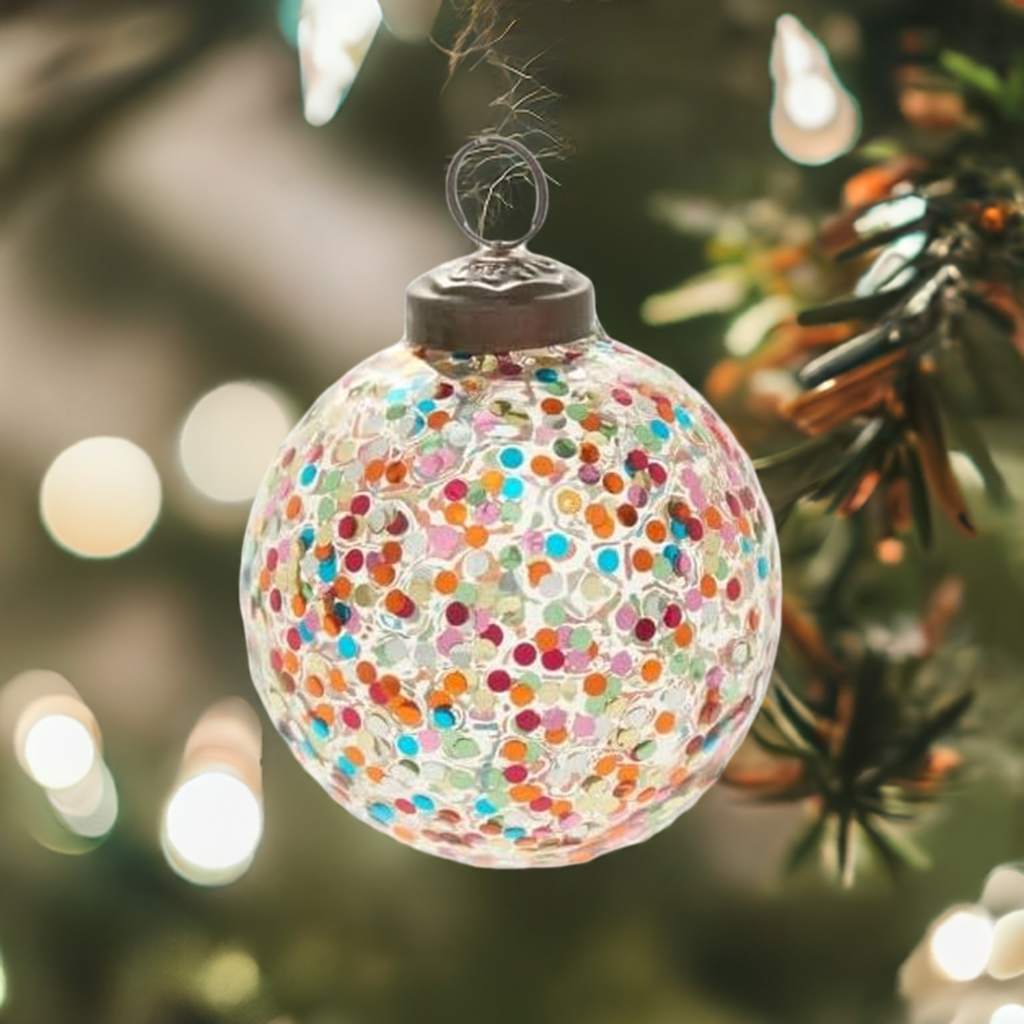 Add sparkle to your holidays with this joyful & colorful ornament. Glass ornament with rainbow colored confetti. Multi colors make it a great accent for a variety of styles.