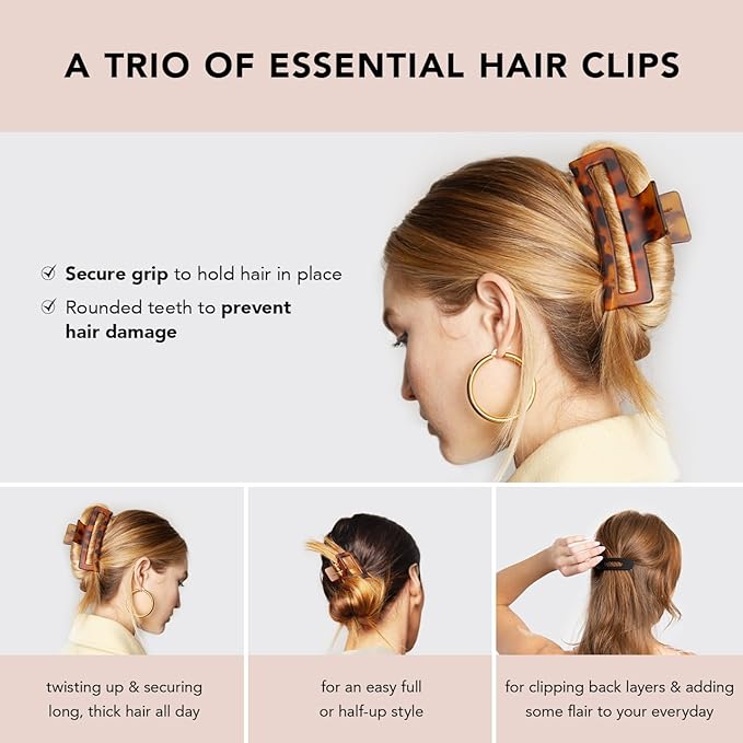 - Include an oversized, open-shaped clip for twisting up and securing long, thick hair all day