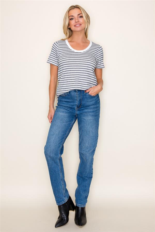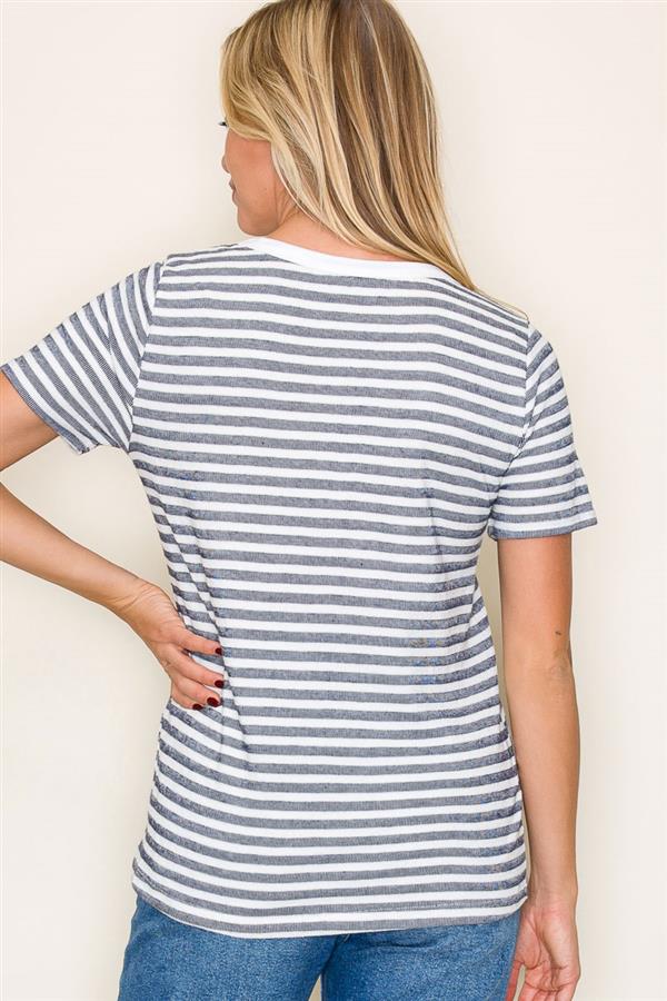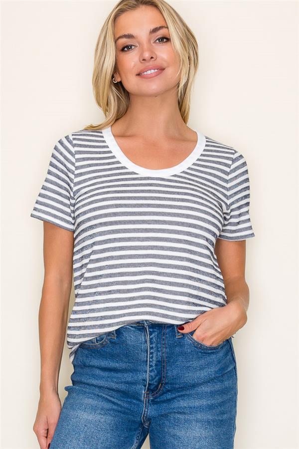 Round Neck Short Sleeve Navy Striped Top, Ivory | Staccato