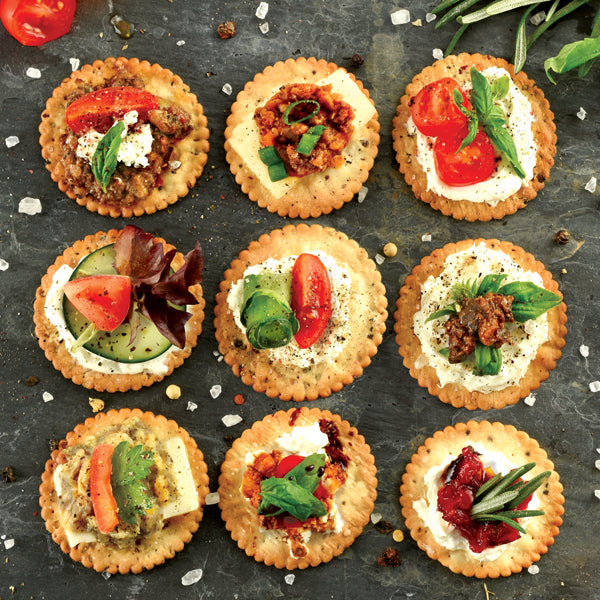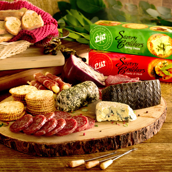 ELKI's Gourmet Garlic Herb Crackers are a wonderful blend of roasted garlic and flavorful herbs. A delicious snack right out of the box or paired with your choice of toppings, meats, cheeses, dips and spreads.