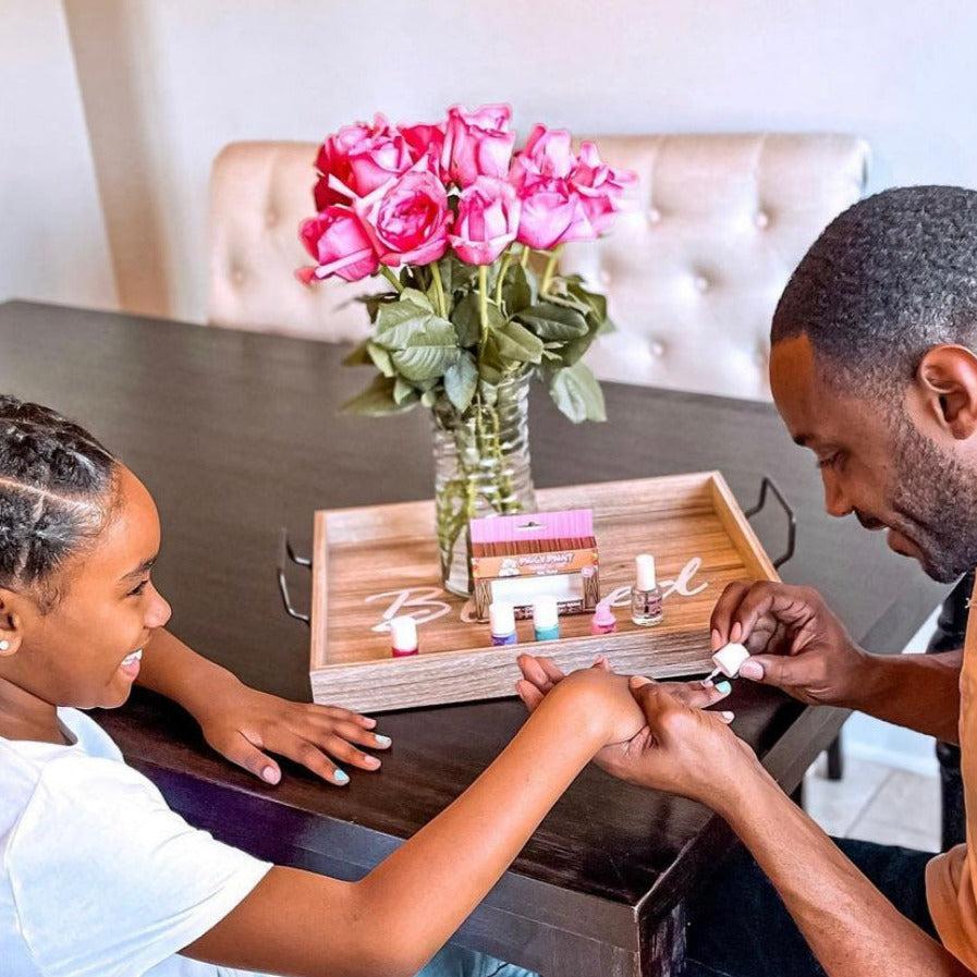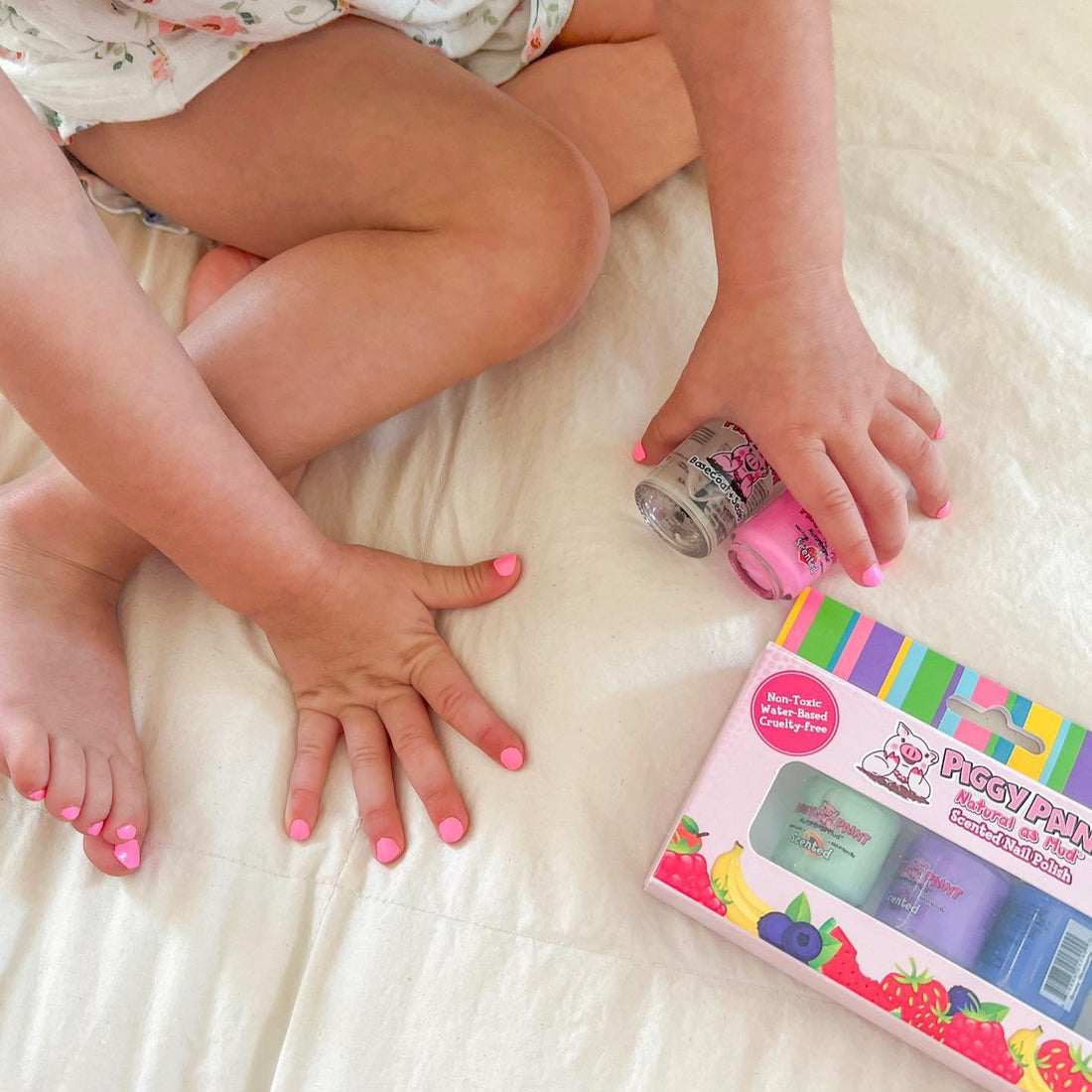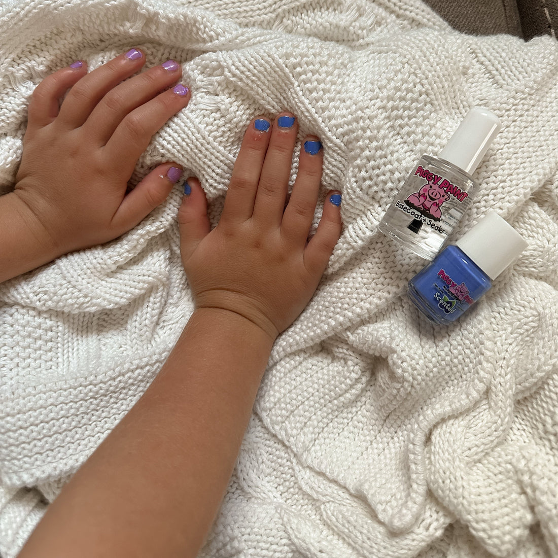 EXPERT TIP: Piggy Paint dries to the touch the same as traditional polish but takes longer to cure (since it doesn’t have any harsh chemicals). BLOW DRY polished nails for 1 minute with hair dryer set on warm heat, low blower setting. Sing your favorite song together for extra fun!